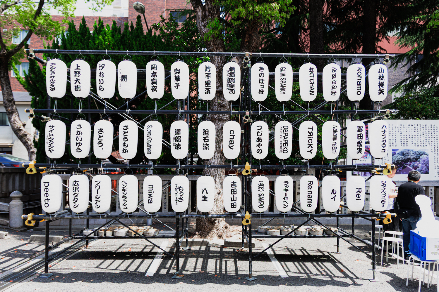 鳥居をくぐった先には、出演アーティストの名前入りの提灯がずらり。ギターの形のフォトプロップスも用意されていて、訪れた人は皆楽しそうに記念写真を撮っていた。