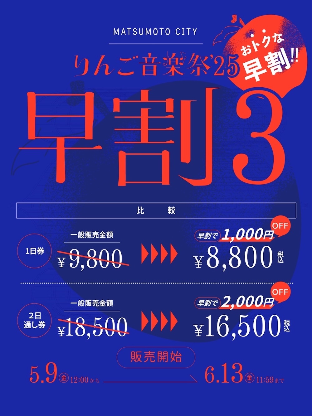現在、【早割3】に続き、お得な【早割3】通し券、【早割3】1日券、そしてキャンプサイト券、休憩広場券、駐車券がe+にて枚数限定で販売中。(駐車場は2023年度より有料)