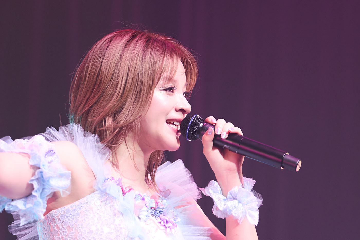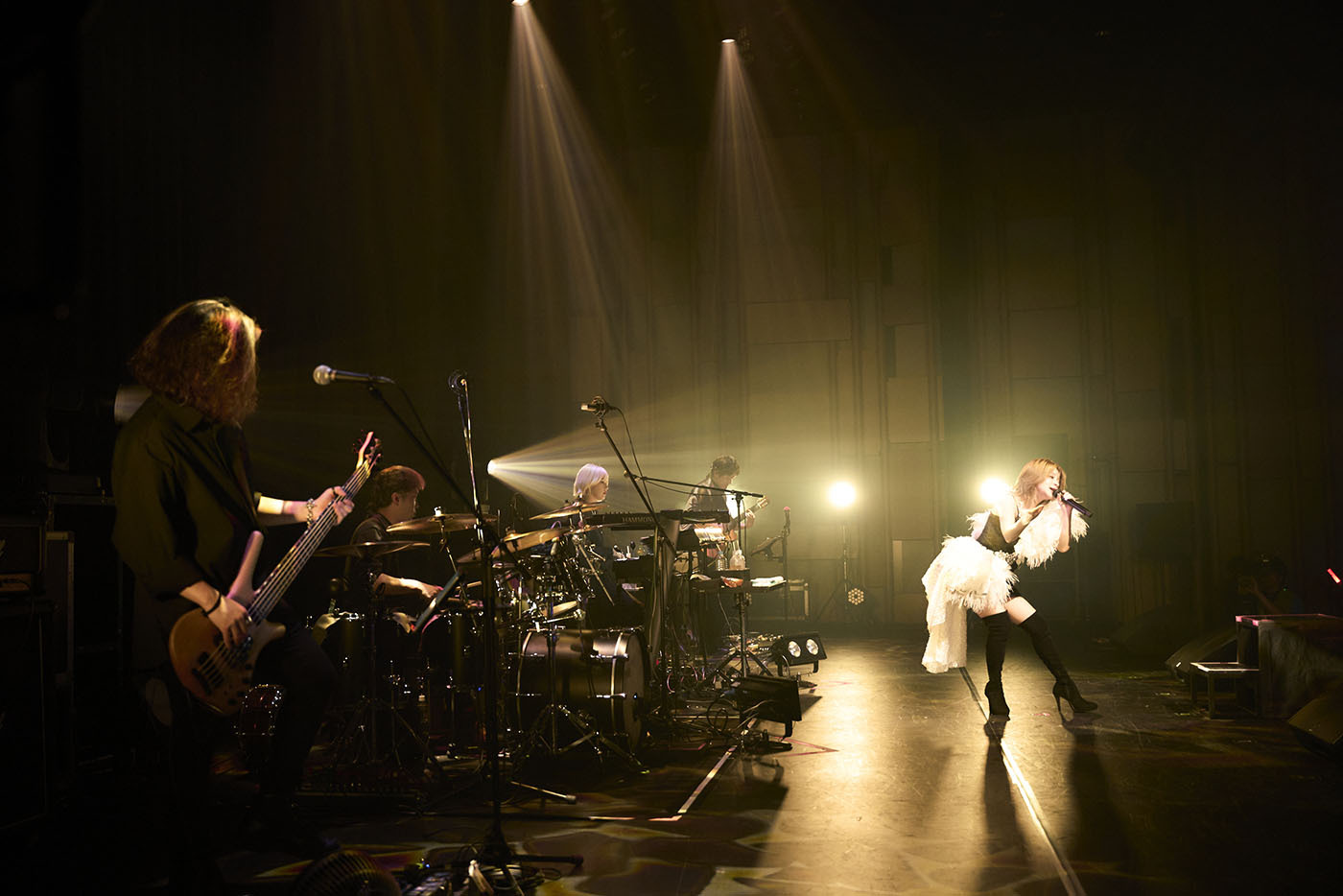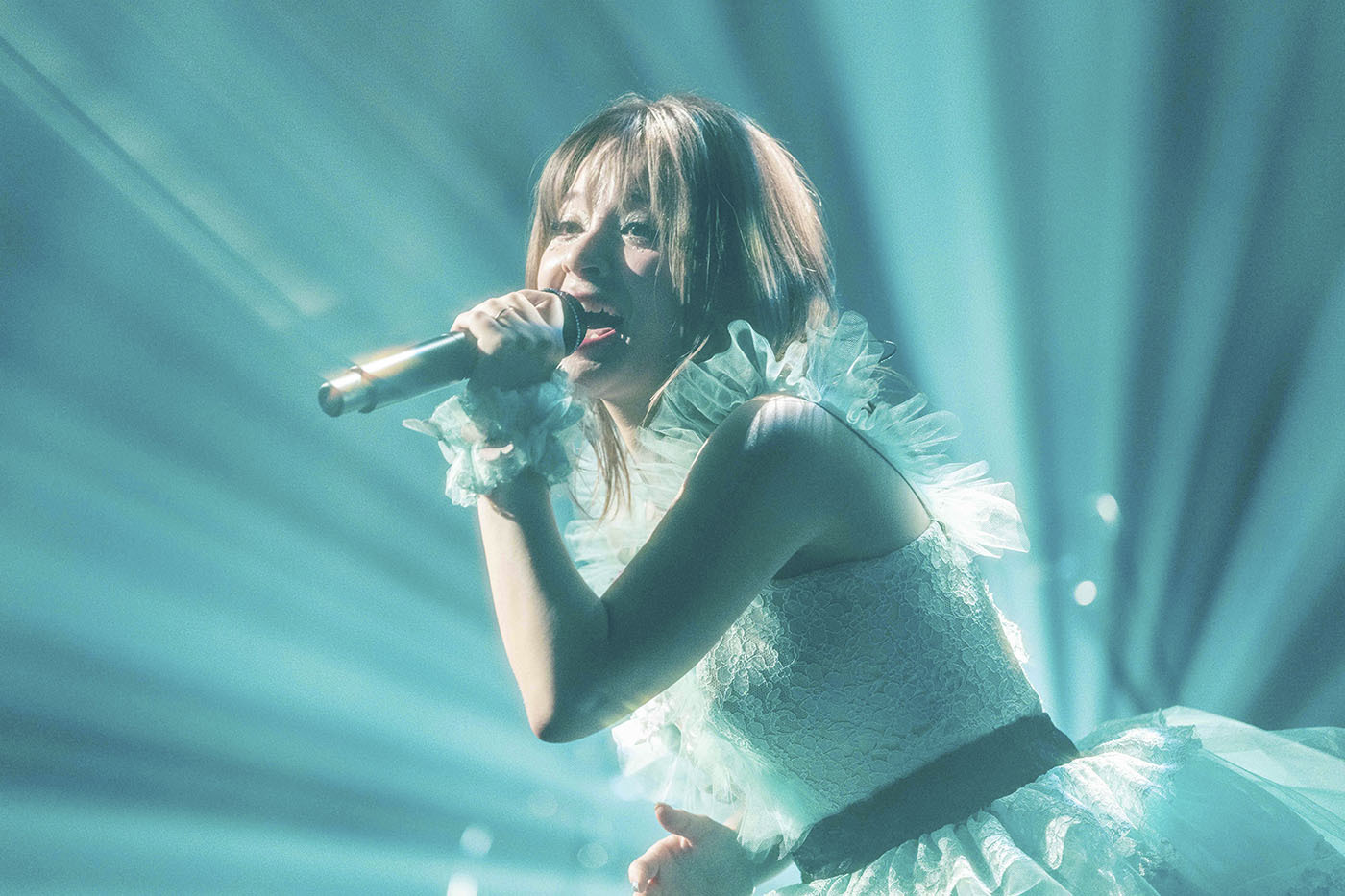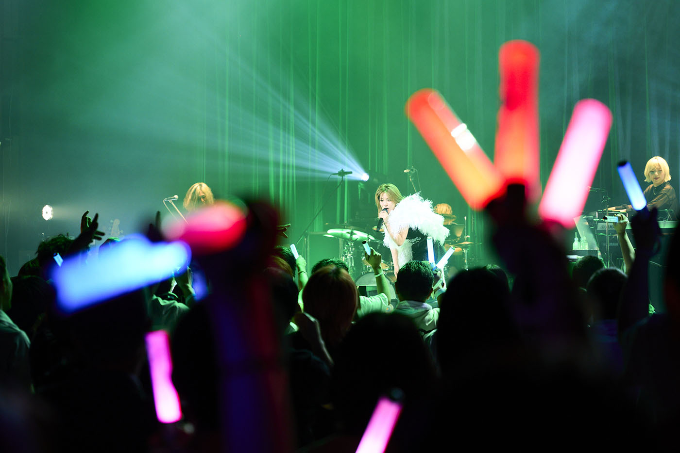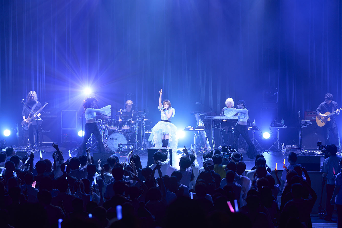 メドレーのエンディング、「最高だね!」と満面の笑顔とともにMARiAがステージをあとにし、バンドが幕間のそれと言うにはあまりにもリッチでピーキーなシューゲイザー的なセッションを披露すると、それまでのスポーティでセクシーな出で立ちから、淡いブルーとホワイトのコントラストが映えるドレス姿のMARiAがステージに舞い降りる。これに歓声が起こる中、彼女はこれまで海外公演では披露していたという中島美嘉「雪の華」をジェントルにカバーすると、続けて「大大大先輩の曲」と、angela「Shangri-La」をドロップ。ノリのいいファンが〈さよなら 蒼き日々よ〉の歌詞になぞらえてペンライトの色を青に切り替え、また別のファンはangelaのライブよろしくマフラータオルを振り回すなど、会場の熱気はさらなる高まりを見せていた。