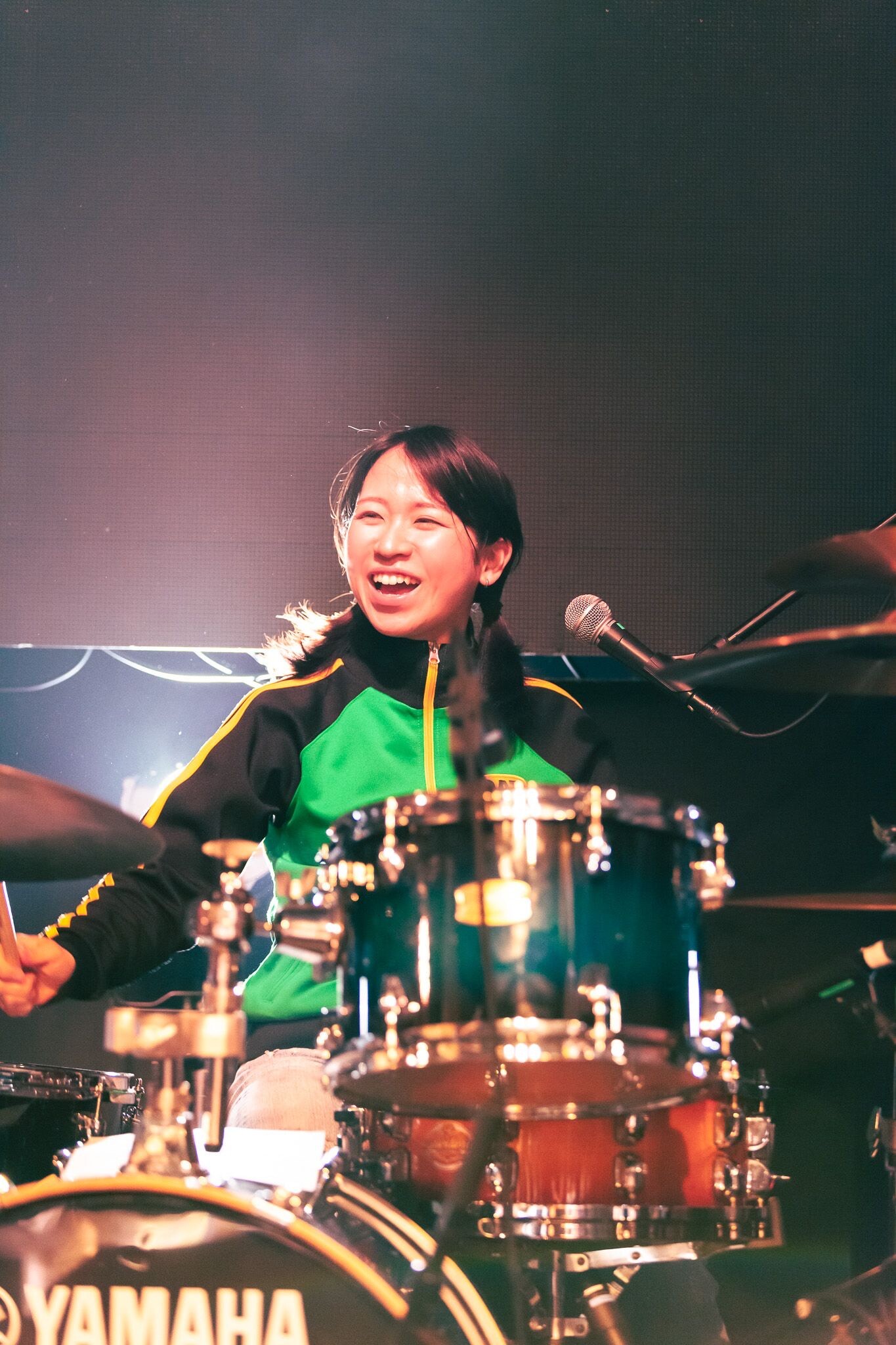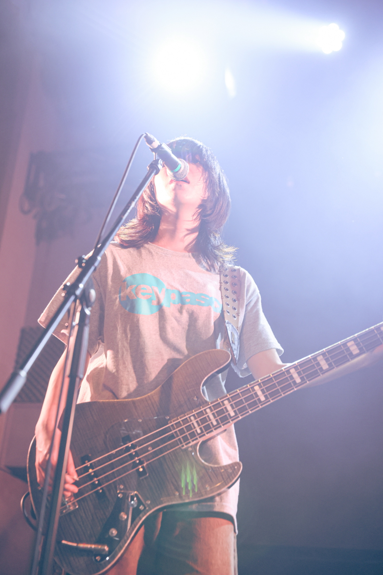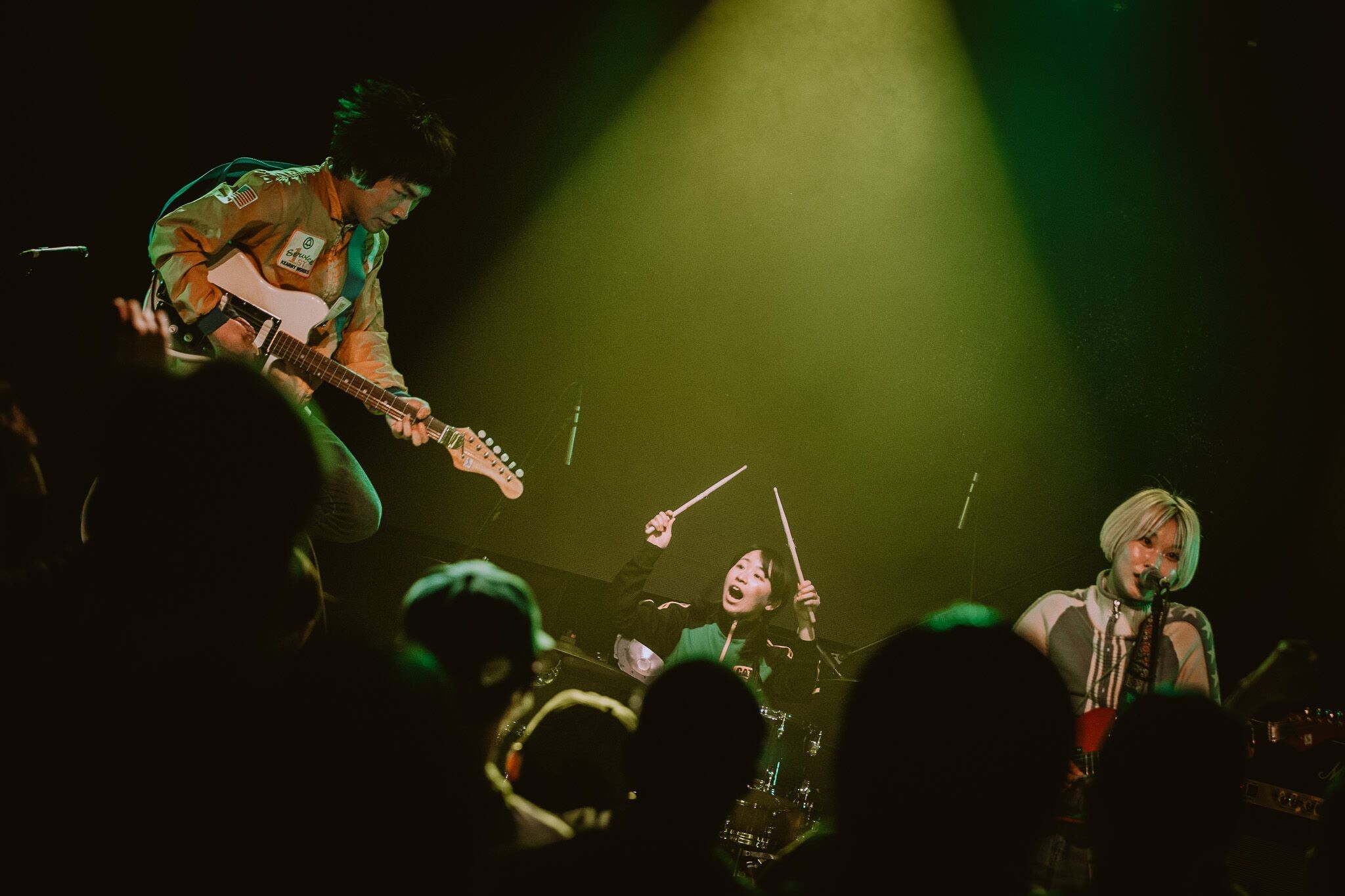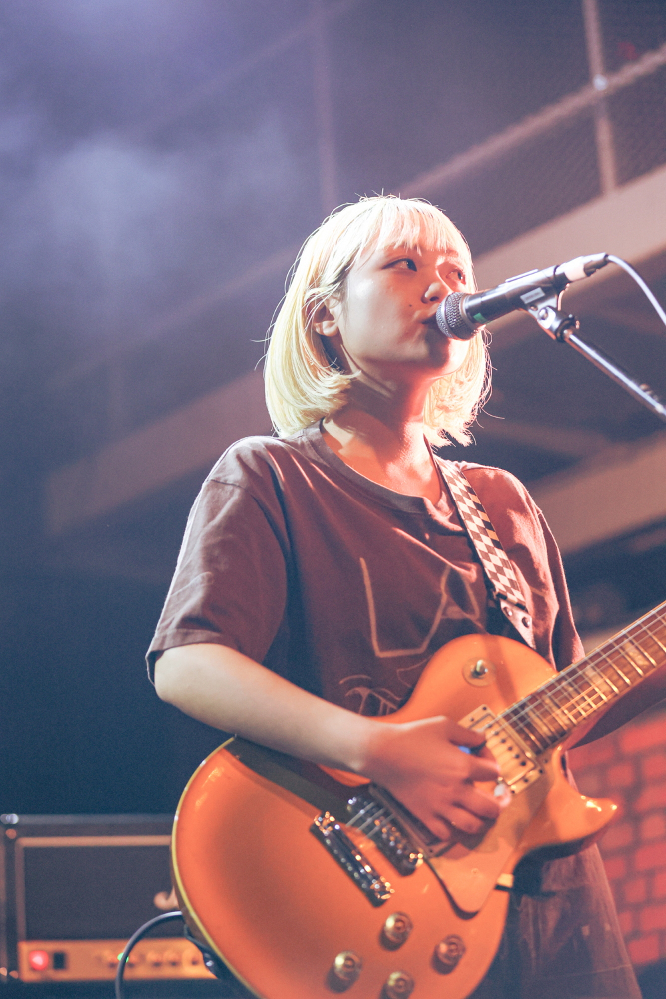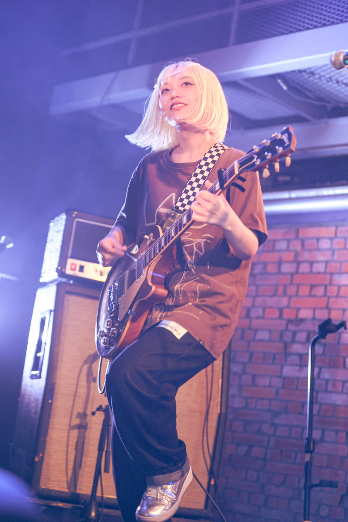 客席に外国人の姿が多いと見るや、すかさず英語でバンド紹介をやってのける、まなの才気と度胸には大物の予感がする。「微熱」「Wednesday」「dull」と、スロー/ミドルテンポのドリーミーでたゆたうような音空間の中に変拍子を取り込んでハッとさせたり、緊迫感ある演奏の最後にはにかんだ笑顔を見せてほっとさせたり。アンコールで披露した「どく」も含めて全7曲、芸術点の高いバンドが好みのリスナーにはドンズバのバンドだ。