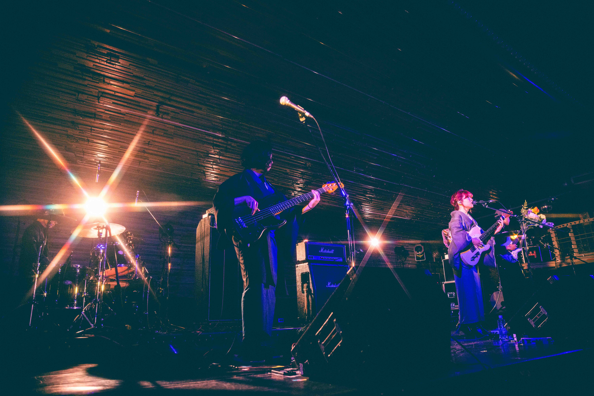 変拍子を感じたりと、ひとつひとつの音に興味が向くし、何よりも福田の歌声にも物憂げさや彩りや様々な情感がある。インプロビゼーションの如くな演奏にも魅せられて、ずっと音は続いていく。ここで手に持っていたセットリストを追うのを止めた。今どの曲を演奏して歌っているというよりは、ひとつの音楽を、ひとつの歌を、ひとつの物語を浴びているように思えてきたのだ。音も声も脳と心の中に自然と入ってきて、自然と溶けていく。