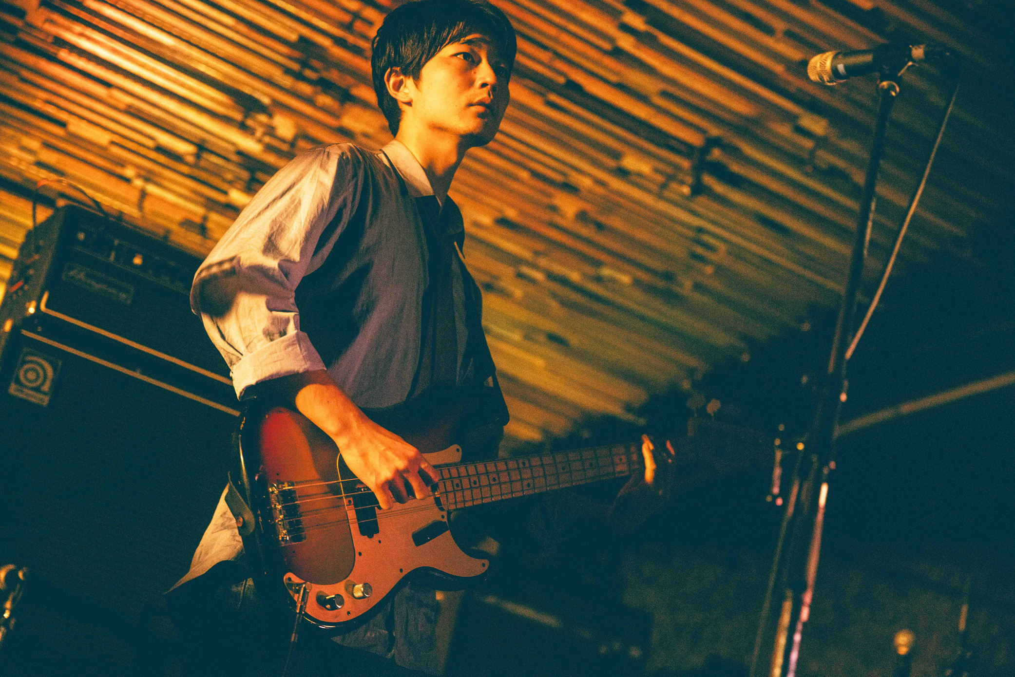 弐番風呂は地元関西を中心に活動するQoodow。1曲目「水槽」からドラム一発目のカキーンと音の鳴りが良いのに、何とも言えない重さ深さも脳と心に突き刺さってくる。聴く者は音の一発一発に確実に捉えられる、そんな感じ……。「出会いましょう」という福田稜大(Vo.Gt)の言葉も脳に心にこびりつくし、じっくりゆっくり鳴らされる音ながら、爆発していく感もあり、初っ端から目が離せなくなる。2曲目、3曲目とも振り落とされないように、音へと耳を澄ましていく。