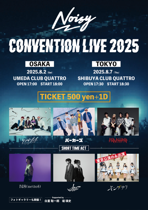 『Noisy CONVENTION LIVE 2025』は、ワンコイン(500円+1ドリンク代)で入場可。チケットは、東京・大阪公演ともにイープラスにて一次先行受付中だ。