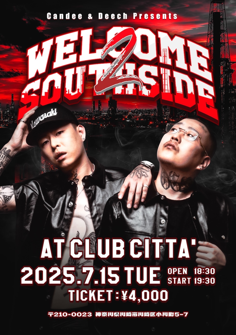 2025年7月15日(火)に川崎を代表するライブハウス・CLUB CITTA’にて、ヒップホップシーンを牽引するCandeeとDeechによる『2MAN LIVE「WELCOME 2 SOUTHSIDE」』が開催される。
