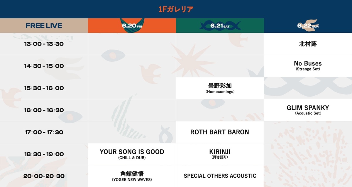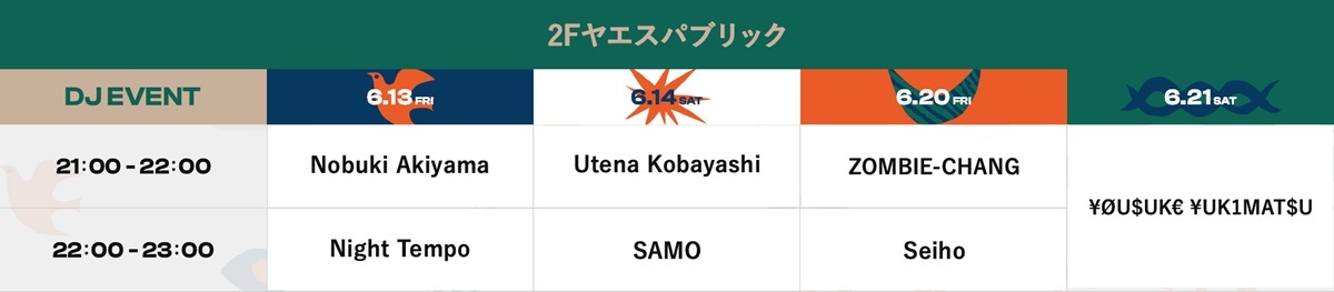 1Fガレリアでは、YOUR SONG IS GOOD(CHILL & DUB)、KIRINJI(弾き語り)、SPECIAL OTHERS ACOUSTIC、GLIM SPANKY(Acoustic Set)など『フジロック』にゆかりの深いアーティストによるフリーライブやワークショップを実施。2Fヤエスパブリックでは、Night Tempo、Seiho、¥ØU$UK€ ¥UK1MAT$UらのDJイベント、さらにヤエスパブリック×フジロックのコラボキャンペーンがパワーアップし、苗場でおなじみのドリンクがヤエパブ内の店舗で楽しむことができる。