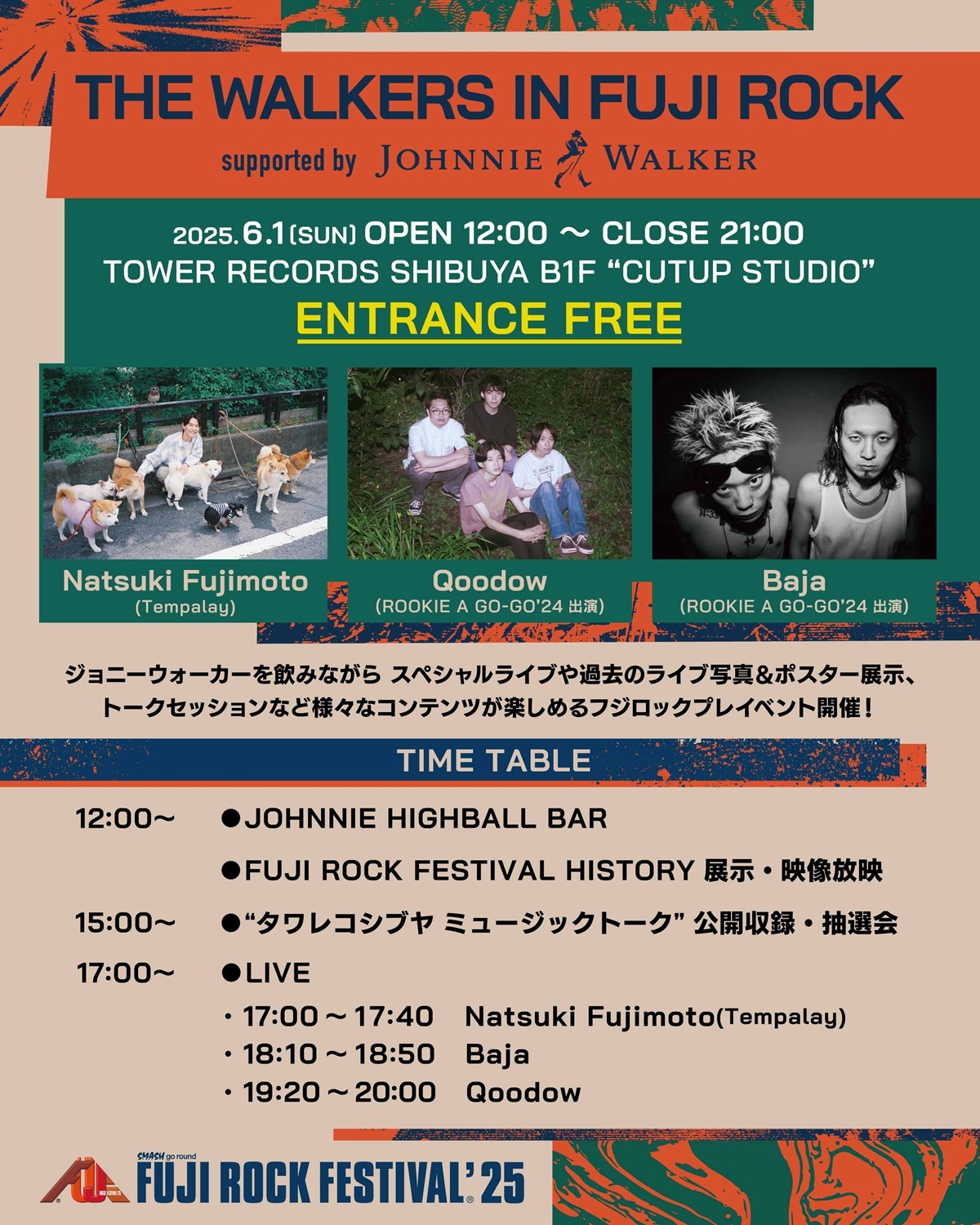 さらに6月1日(日)にはタワーレコード渋谷店B1Fにて『THE WALKERS IN FUJI ROCK』を開催。『フジロック』でおなじみのJOHNNIE WALKERとともに、QoodowやBajaという昨年の「ROOKIE A GO-GO」出演者による入場無料のスペシャルライブ、『フジロック』の過去ライブ写真やポスターの展示、トークセッションなど様々なコンテンツを楽しむことができる。