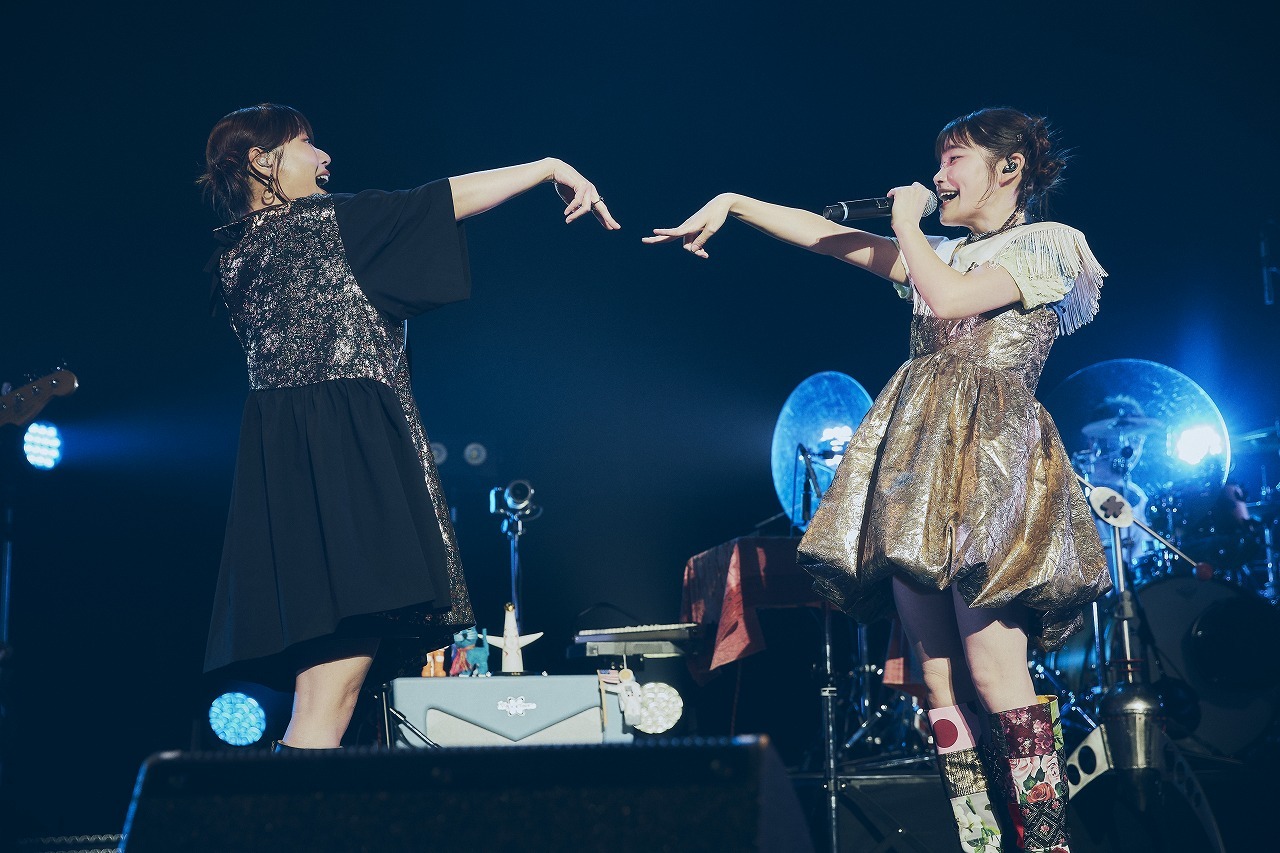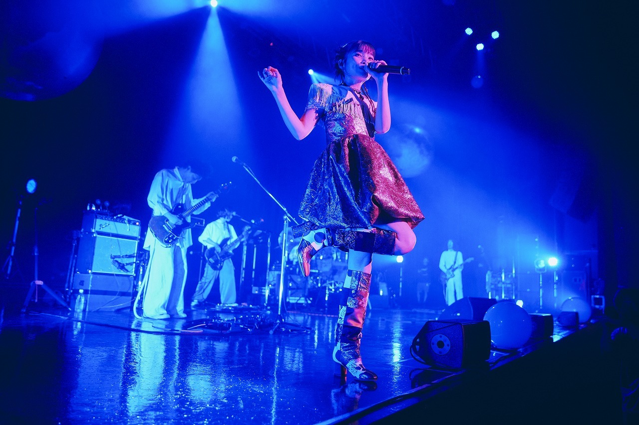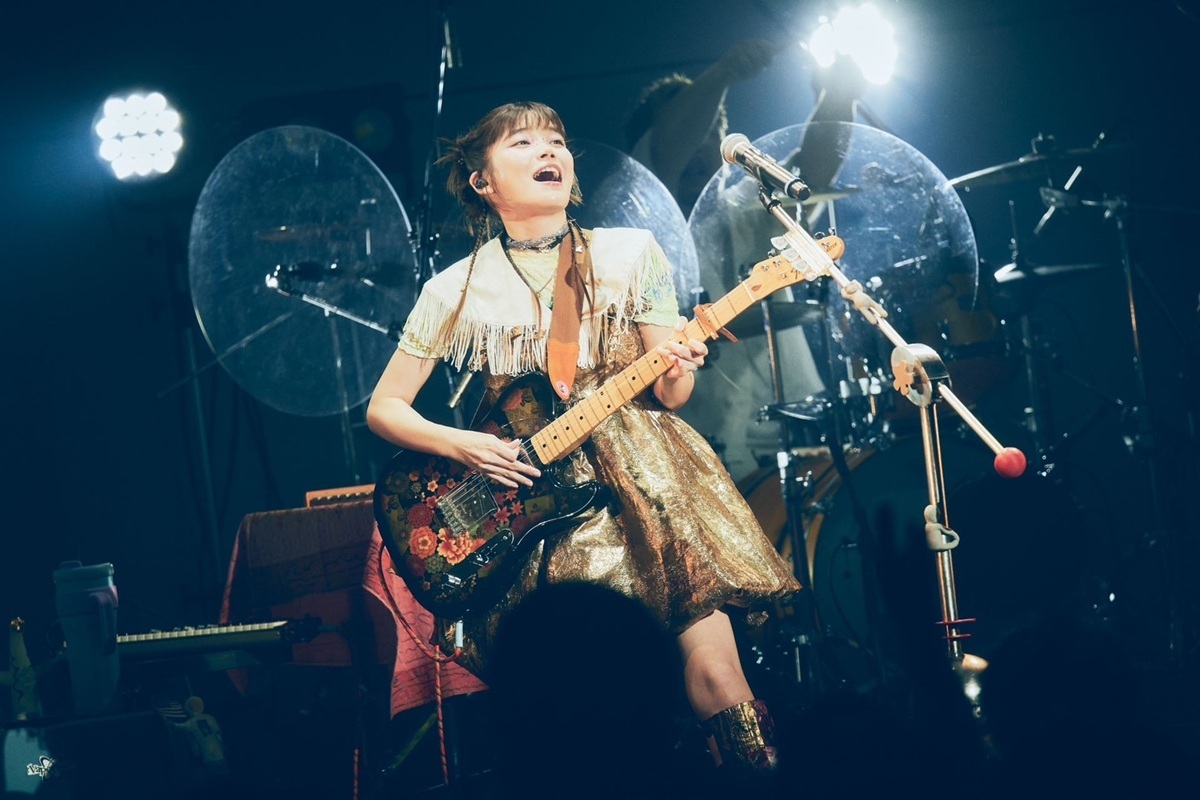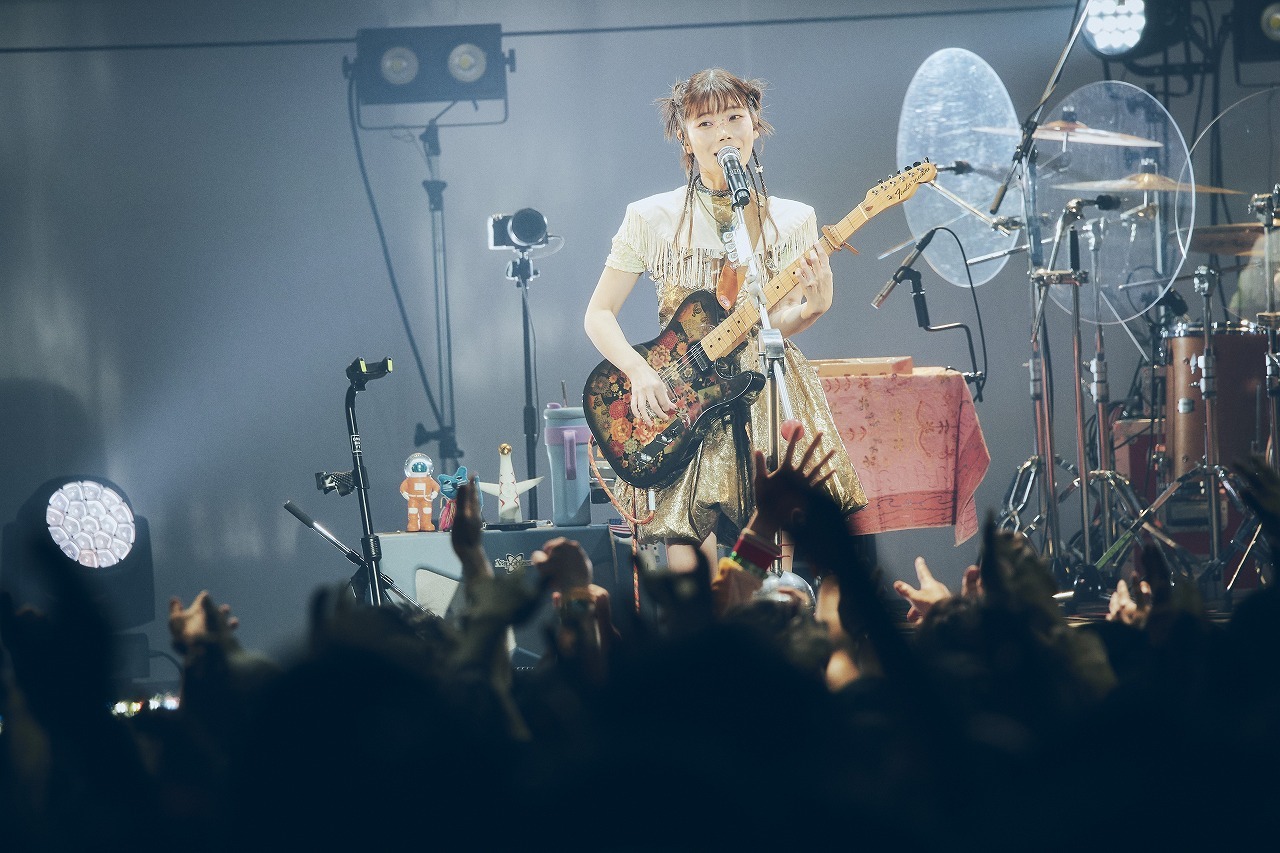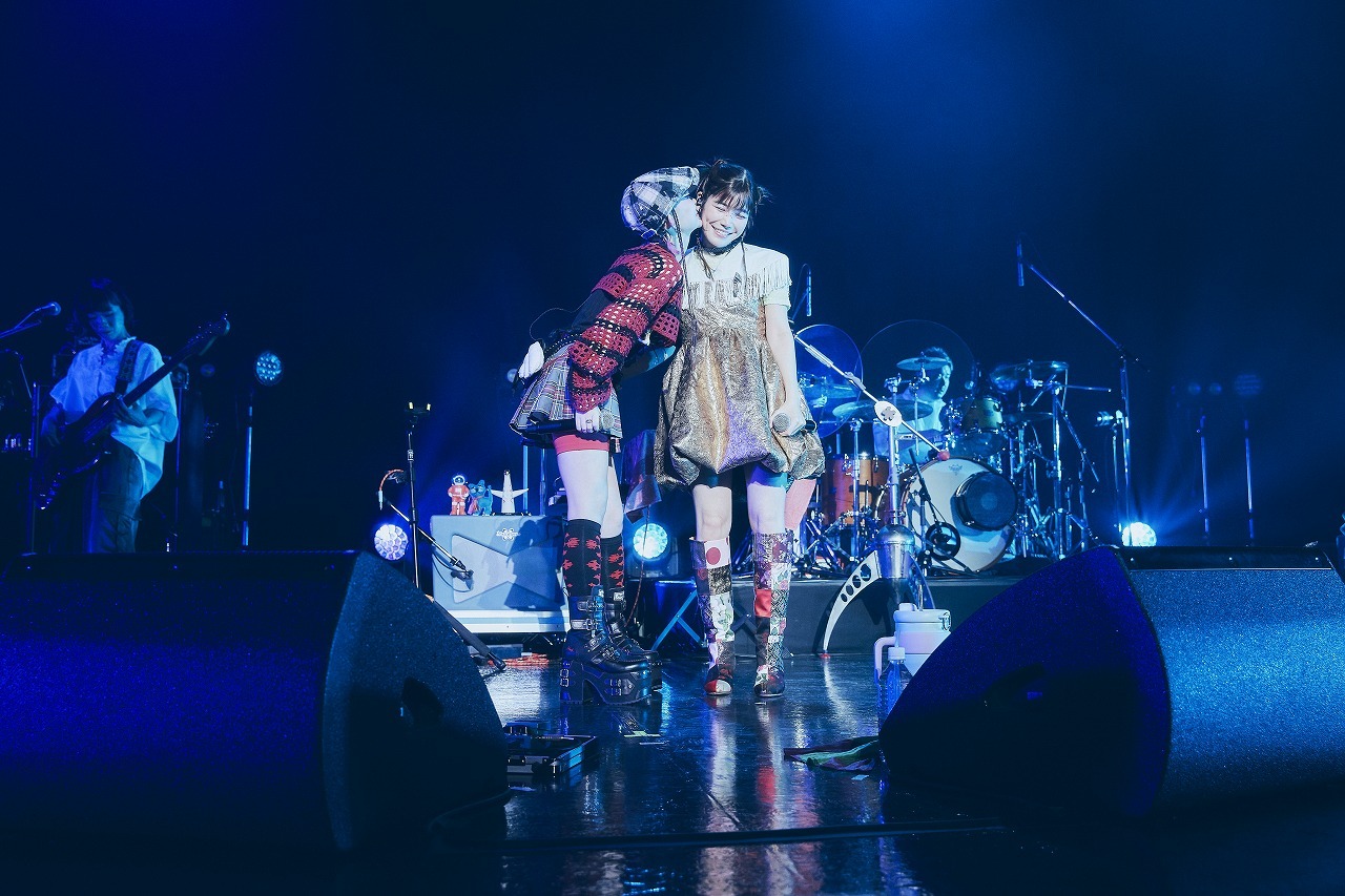 続く新曲は、アニメーションとダンサーが演出に加わり、タオルを使ったパフォーマンスをフロアと楽しむ「Tenugui Galaxy!?」。全編打ち込みのこの曲はバンドメンバーもアクション&ダンスに参加し、ハードに踊った4人はチッチに「大丈夫?」と心配されるほど。そしてメンバー紹介を挟み、スカテイストの軽快なロックンロール「Girlfriend」を経て、ゲストをステージに招き入れる。最初のガールフレンドは「百日草」や「紙ヒコーキと晴れのちコーヒー」「ナポレオーネ通りにて」などを共作した“えみそん”ことおかもとえみ。この日は「ナポレオーネ通りにて」を、二人が意識したというPUFFYを彷彿させる脱力ポップロックで展開。二人目はお互いをフィーチャーしたコラボナンバーをリリースした詩羽(水曜日のカンパネラ)が登場。詩羽のチッチへの好きパワーが素振りからあふれつつ、普段の会話めいたやりとりも微笑ましいテンションのまま、Lo-fiヒップホップテイストの「Linda feat. 詩羽」を極上のバンドサウンドで披露してくれた。女子同士の信頼と無敵感。それぞれ1曲だけではありつつ、強力な必然性を感じる共演だった。