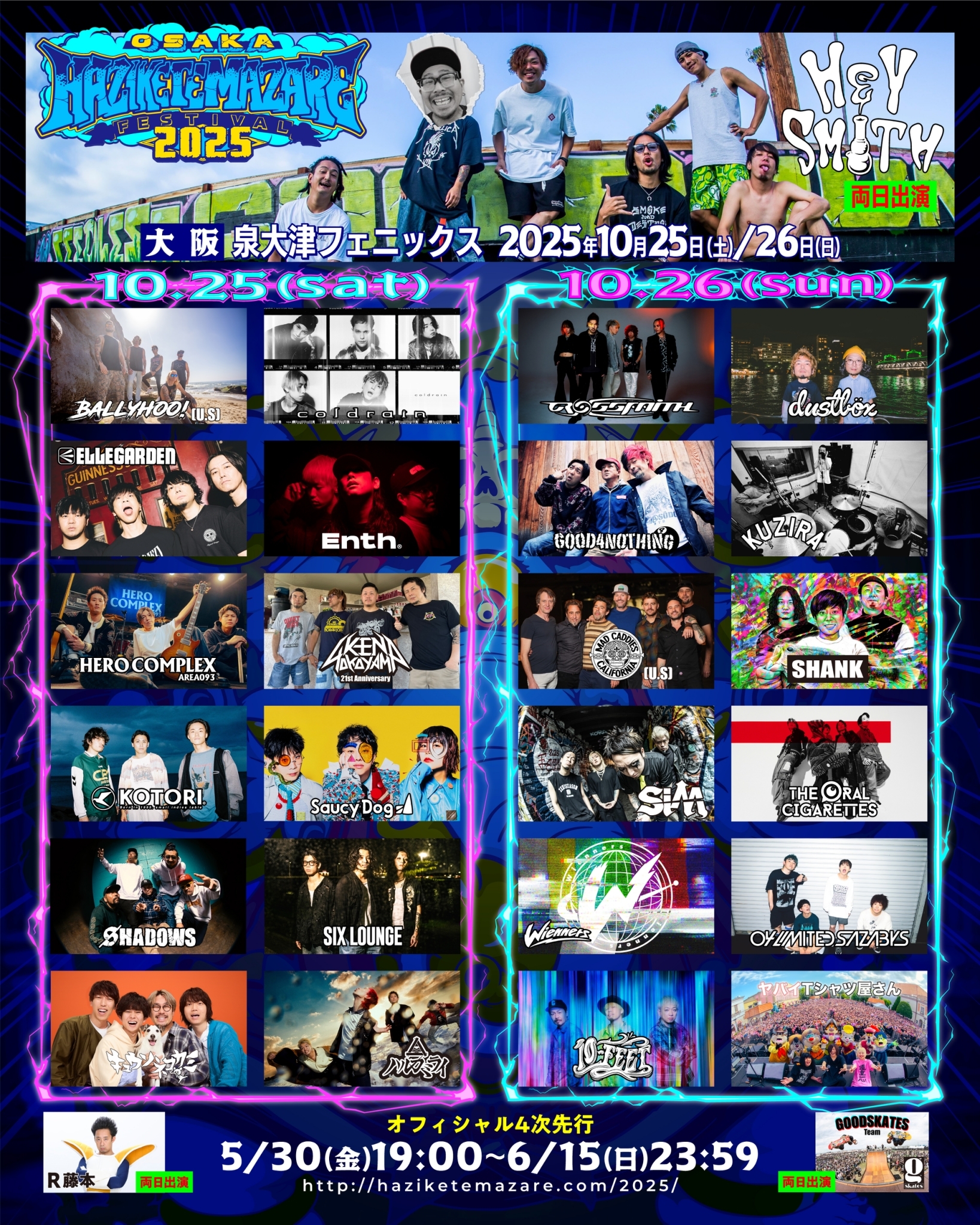 10月25日(土)、26日(日)に泉大津フェニックスにて開催される野外フェス『HEY-SMITH Presents OSAKA HAZIKETEMAZARE FESTIVAL 2025』がアーティストの出演日程を公開した。