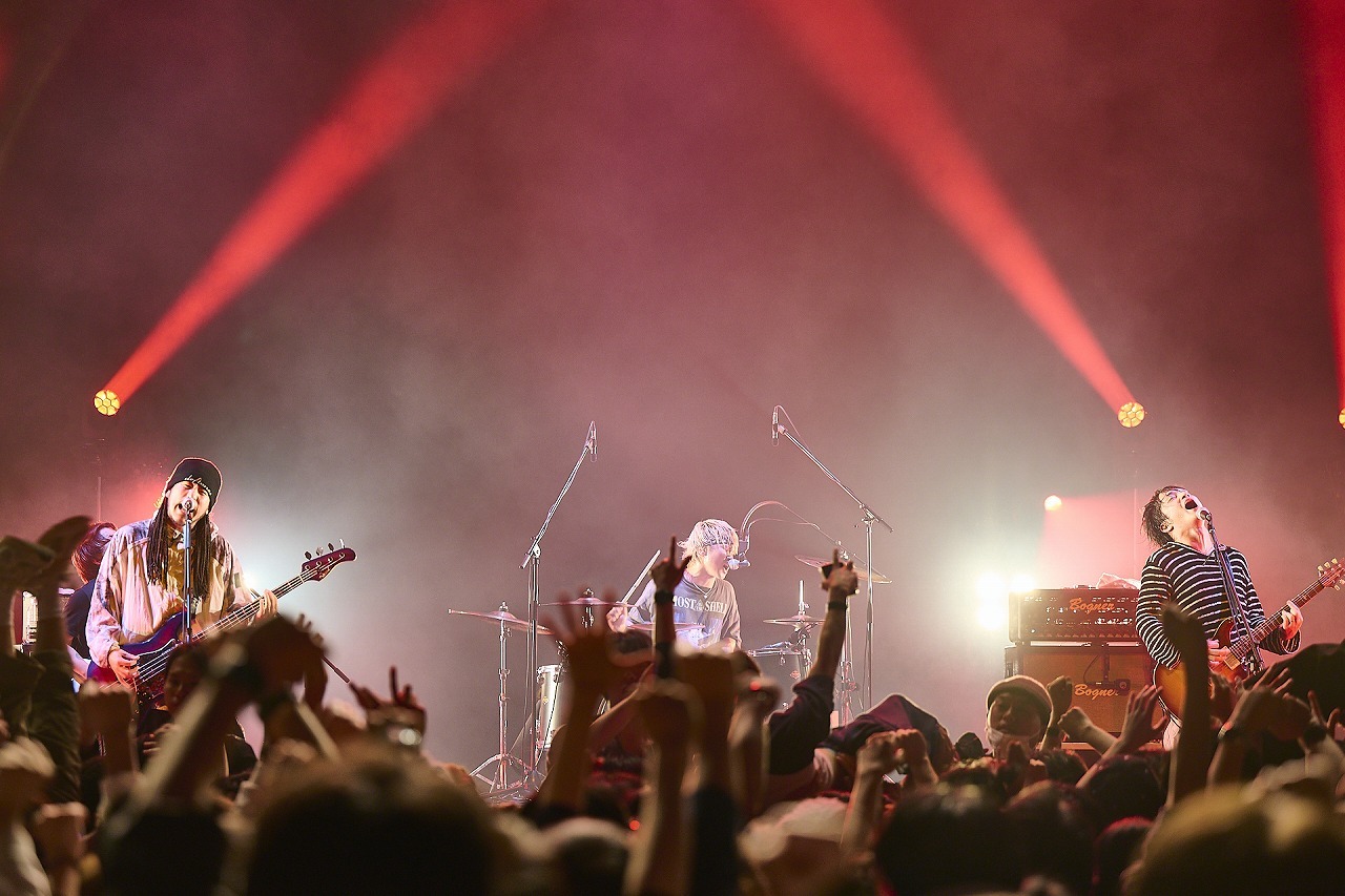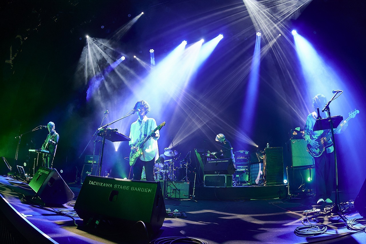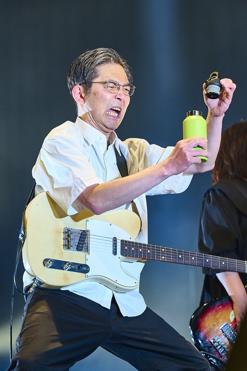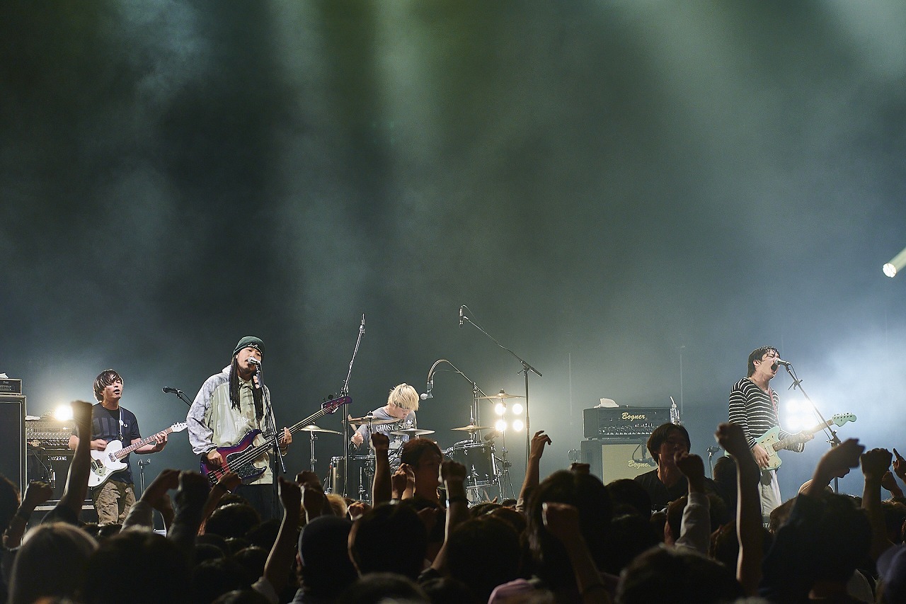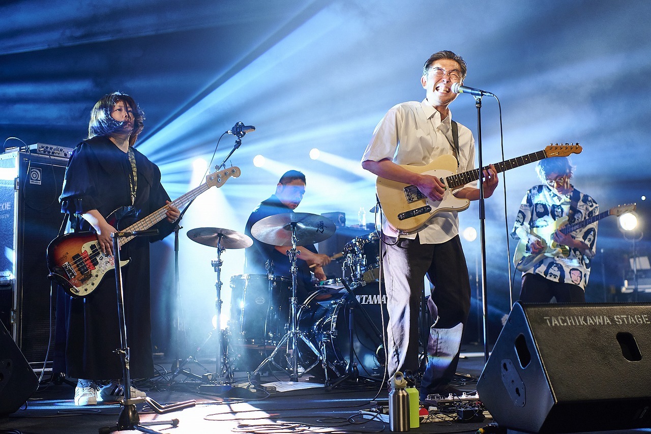 時刻は20時15分、ホールステージの2階席後方の仕切りが取り外され、ガーデンステージまで一望できるようになった。抜群の開放感とフェスの終わりのリラックスしたムードの中で登場したGRAPEVINEは、ビアフェスにぴったり1曲目「IPA」で観客の心をつかむと、ボーカル・田中和将が「早い出番で、そのあと飲むつもりだったのに(笑)」と言いながら、ベテランの貫禄と永遠のバンドキッズの両面を兼ね備えたしなやかな演奏で代表曲を次々と披露。エモ/パンク系が多かったこの日のラインナップの最後を締める、癒し効果抜群の演奏だ。2階席にはすやすやと眠る子供と、見守る親の姿も見える。最後に「今度は早い時間に呼んでくれ!」と笑顔のメッセージを残して、初日のトリという大役を見事に果たしてくれた。