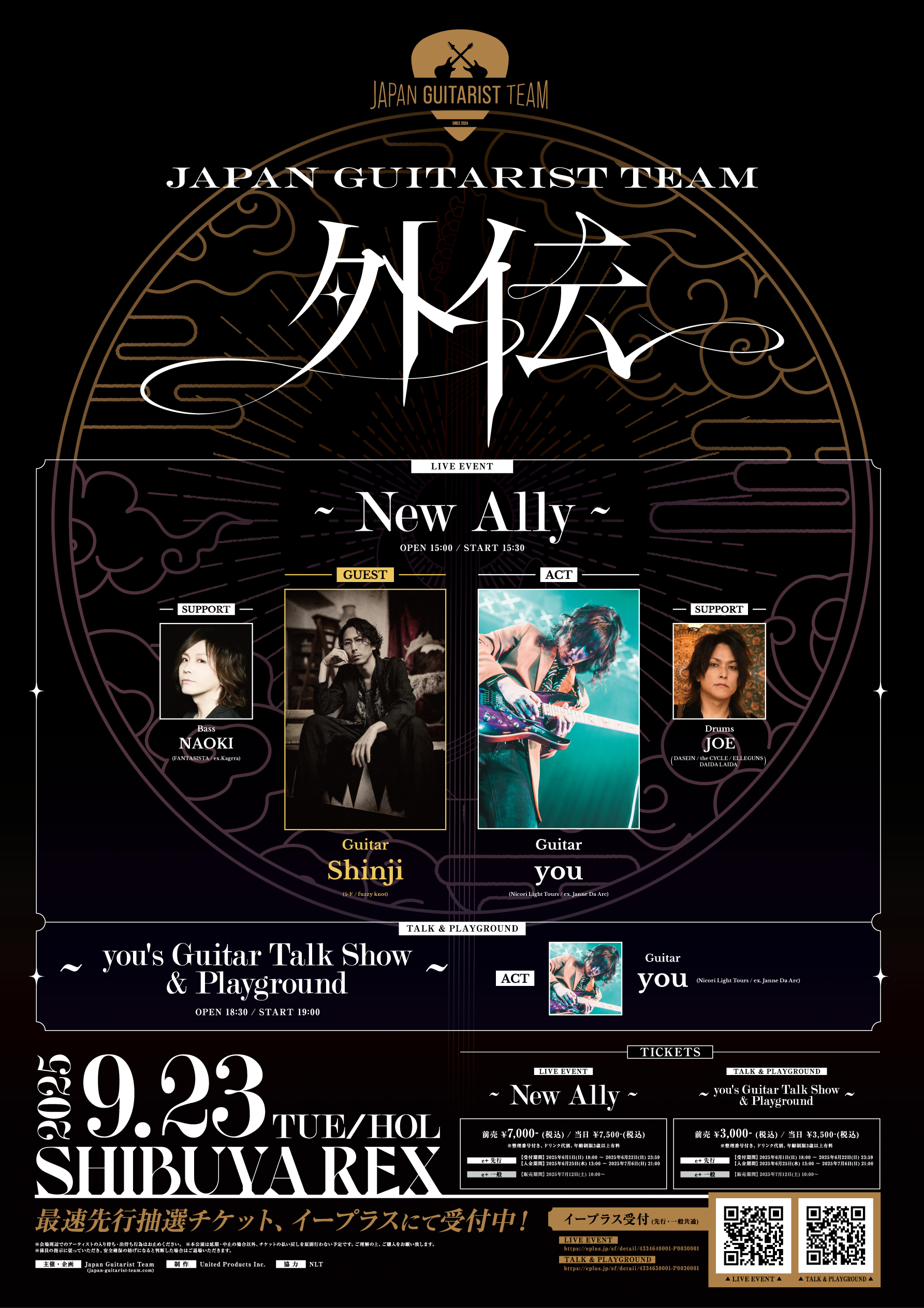 『Japan Guitarist Team 外伝』と名付けられた今回のイベントは、youがゲストにShinjiを迎え、日本を代表する2名のギタリストの夢の共演となる。さらに、ライブ後にはyouがギターの魅力を語るトークイベントの開催も決定している。
