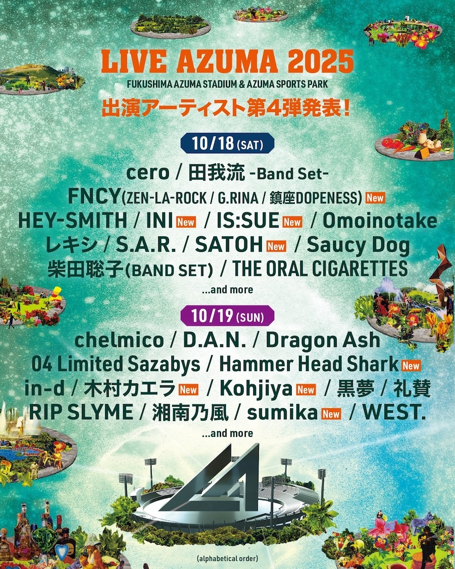 2025年10月18日(土)・19日(日)に福島あづま球場、あづま総合運動公園で開催される『LIVE AZUMA 2025』の第4弾出演アーティストと出演日が発表された。