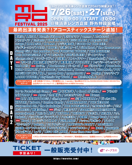 7月26日(土)・27日(日)に神奈川・横浜赤レンガ倉庫で開催される『MURO FESTIVAL 2025』から、最終出演アーティストが解禁された。