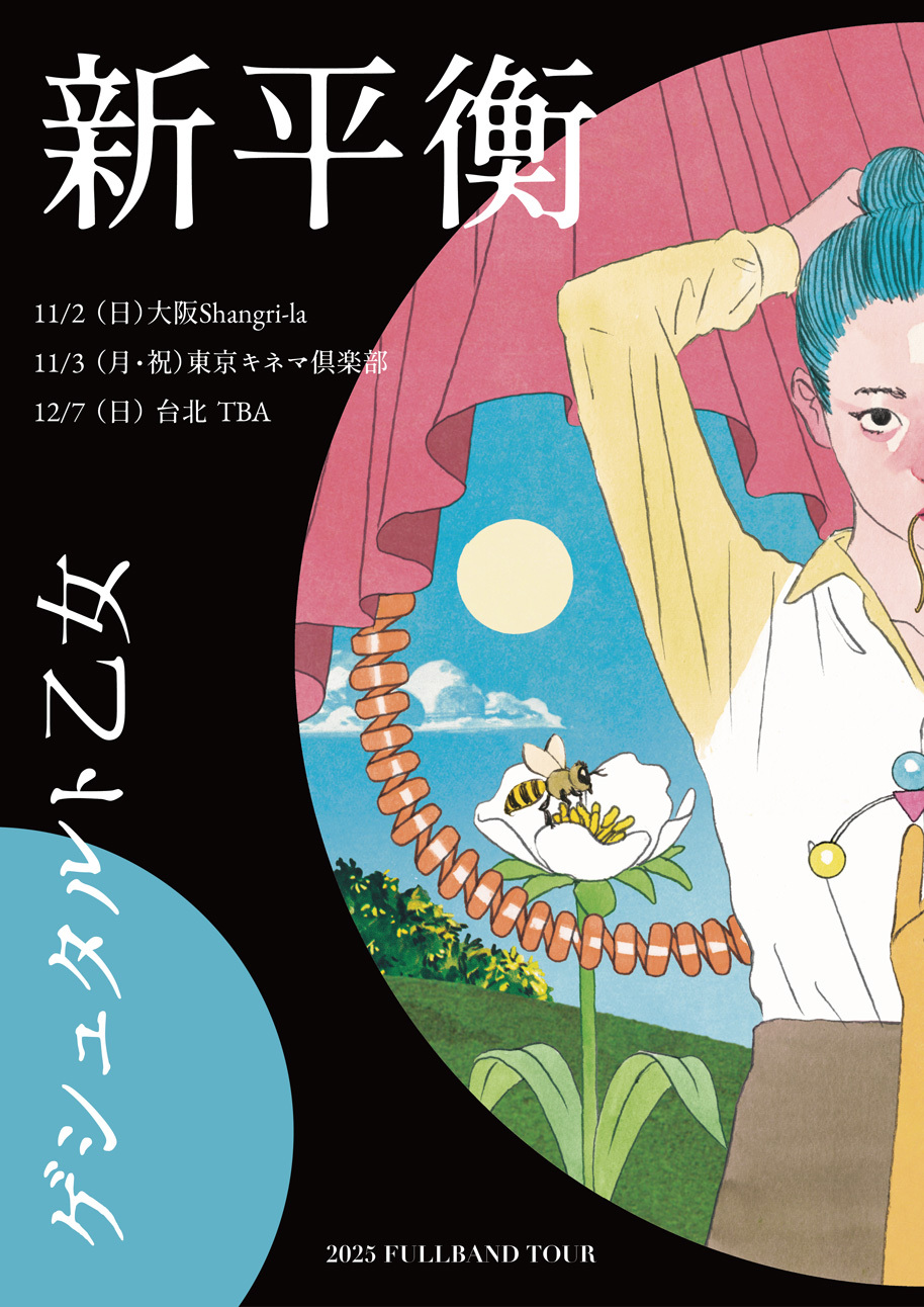そんな彼女らが今回掲げるツアータイトルは『新平衡(しんへいこう)』。本ツアー『新平衡』には、「働き」と「休み」のバランスを見つめ直すというテーマが込められている。去年9月にリリースしたEP「仕事」からの反響で、ライブ空間を“ひとつの休み”として捉え、観客それぞれの心に余白をもたらすことを目指す。また、対バン形式によってジャンルを越えた音楽の交差を生み出し、各バンドの個性が際立つ自由な表現の場となることを意図している。