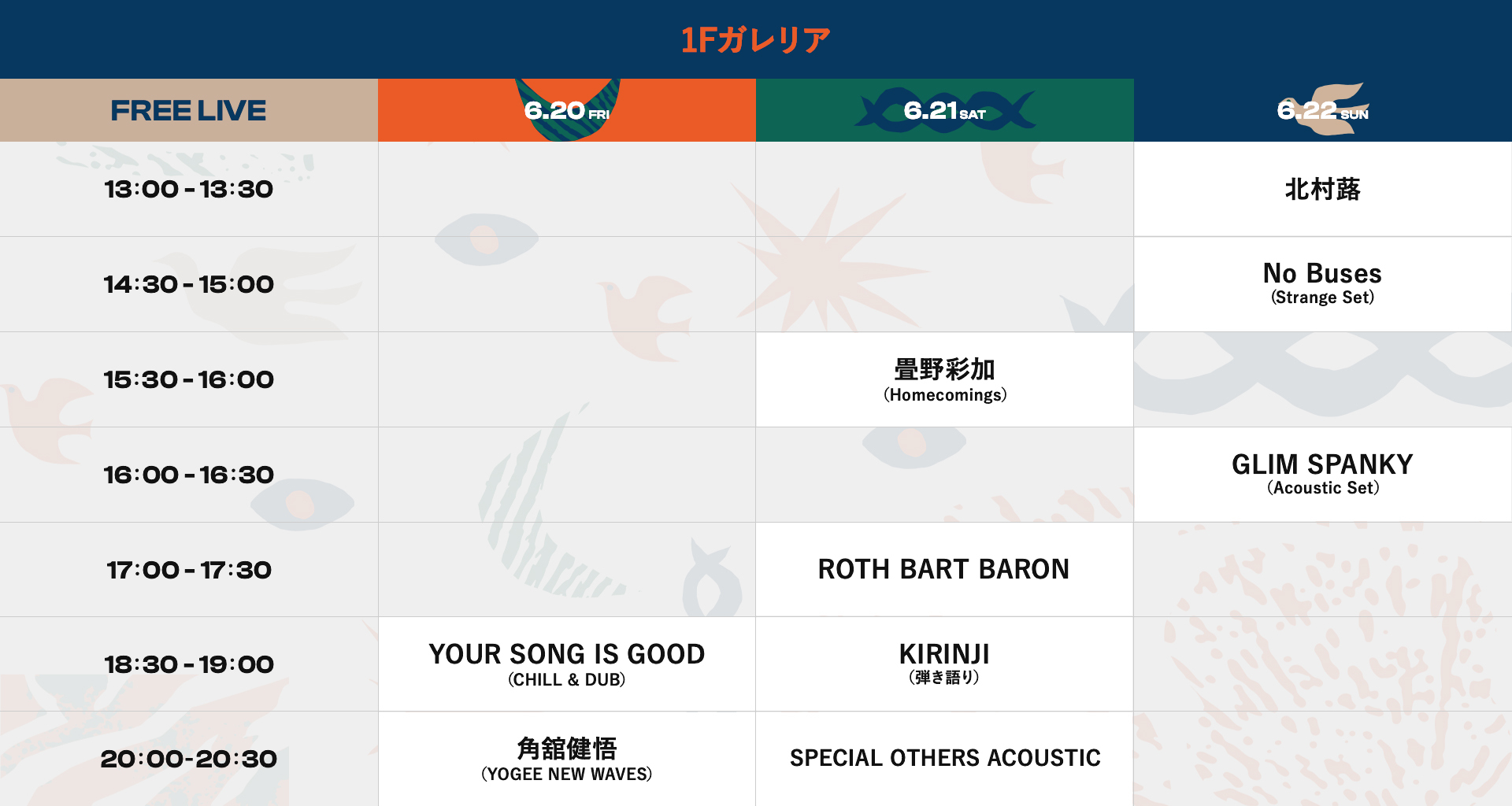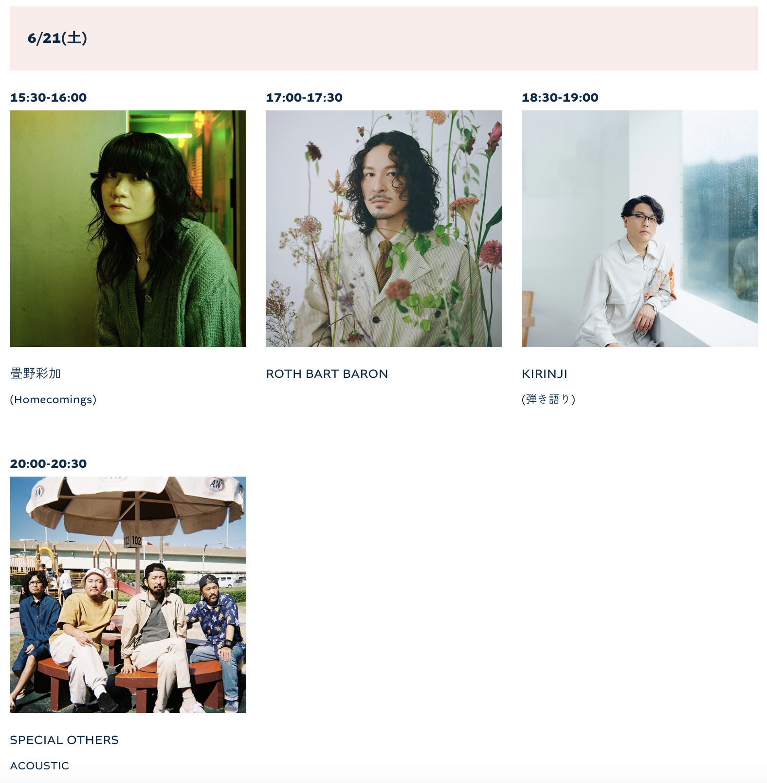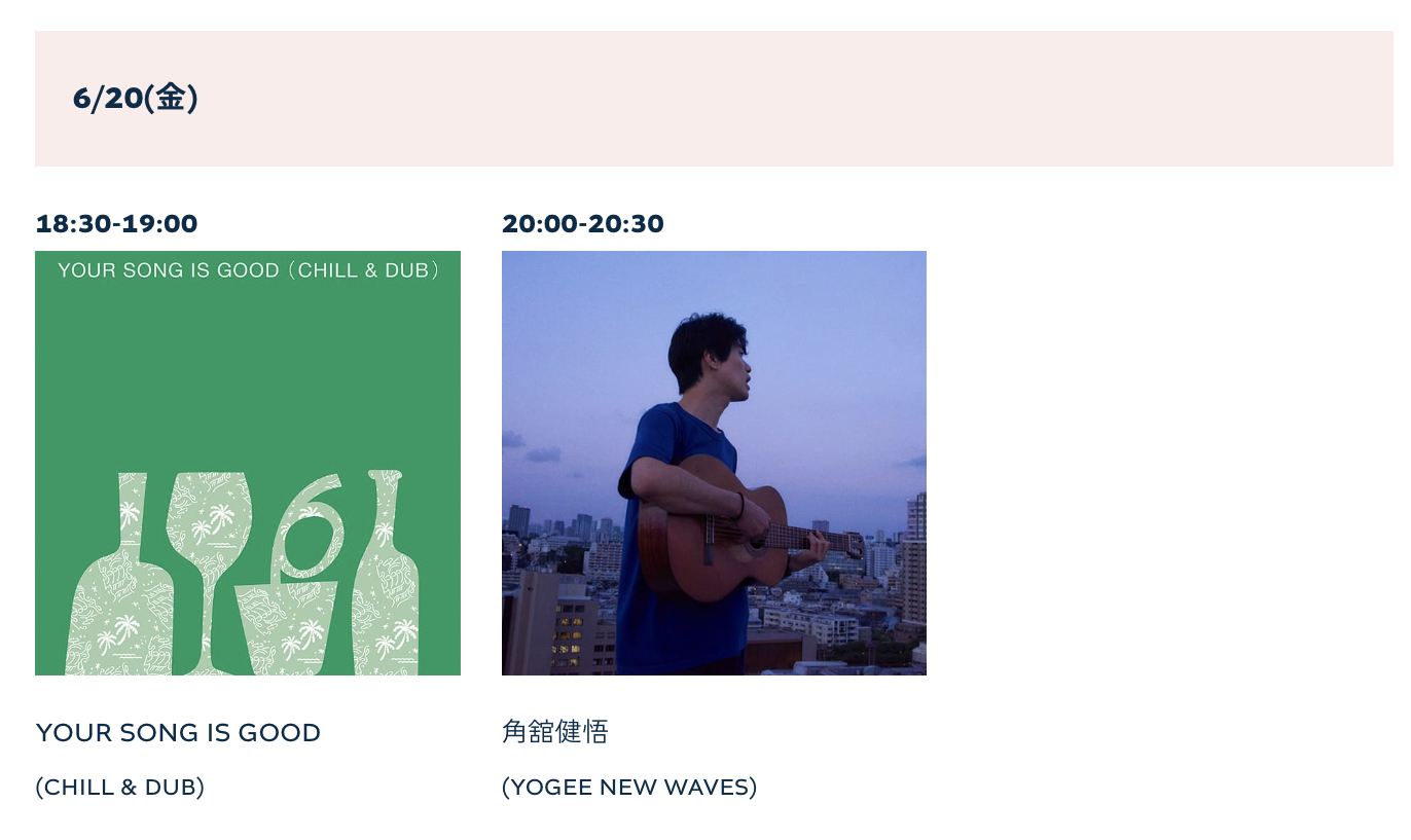 20日(金)の出演はYOUR SONG IS GOOD(CHILL & DUB)、⾓舘健悟(YOGEE NEW WAVES)、21日(土)は畳野彩加(Homecomings)、ROTH BART BARON、KIRINJI(弾き語り)、SPECIAL OTHERS(Acoustic Set)、22日(日)は北村蕗、No Buses(Strange Set)、GLIM SPANKY(Acoustic Set)。これだけ豪華な出演者が登場するライブだが、入場は無料! どうぞお見逃しなく。