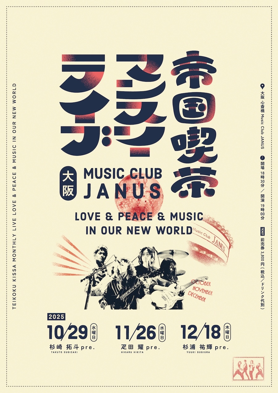 バンド内に3人のメロディーメイカーを擁する帝国喫茶ならではの企画で、各公演ごとに1人のメンバーが作詞作曲を手がけた楽曲にフィーチャーし、その日限りの限定グッズや演出がみれる、彼らのホームグラウンドでもある心斎橋 Music Club JANUSで届ける特別な内容となる。また、アクリ(Gt)が描き下ろしたマンスリーライブのビジュアルもあわせて公開された。公演のチケットは本日・6月30日(月)よりオフィシャル先着先行がスタート。