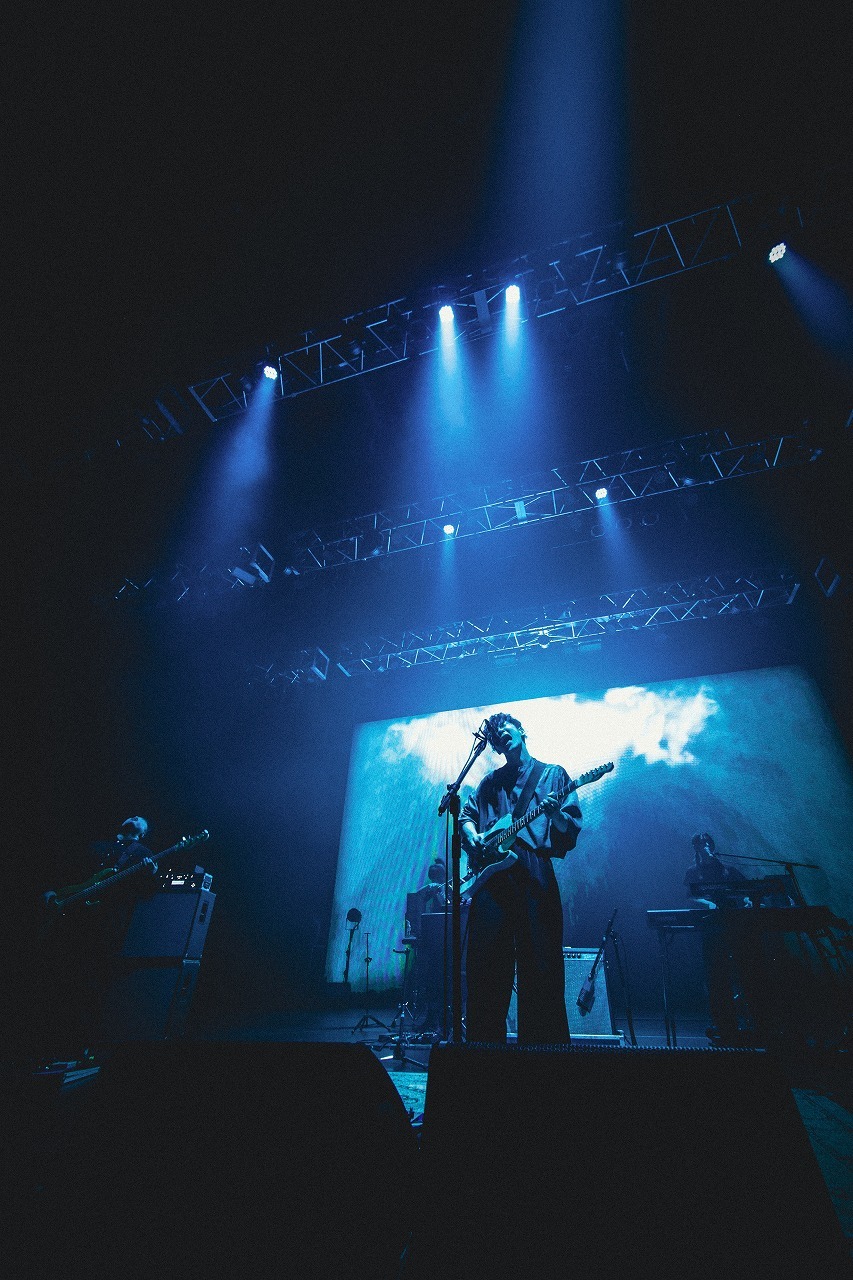 会場のライトが消えると、しばらくしてサポートメンバーが舞台へと上がる。それに続いて最後に現れたTKは、深い碧色のサテンシャツと黒のリラックスパンツという姿で、1曲目の「Microwaver」を歌い上げる。そして、2曲目は「クジャクジャノマアムアイア」。ライティングの色調は赤へ切り替わり、続く「Synchrome」ではホワイトを主体とする映像がスクリーンに映し出された。TKの生み出す鋭いサウンドとともに、映像とライティングで視覚的にも観客の心を揺さぶり、序盤からTKの世界へと引き込んでいく。このような音と映像が織りなすダイナミズムは、アルバム『Whose Blue』の完全生産限定盤においても、音源+TKによる撮り下ろし写真集+映像作品という形で体現されている表現手法だ。この日のステージはさらに「flower」「phase to phrase」と続き、「Shandy」では激しいギターサウンドとハイトーンボイスが場内に響きわたった。