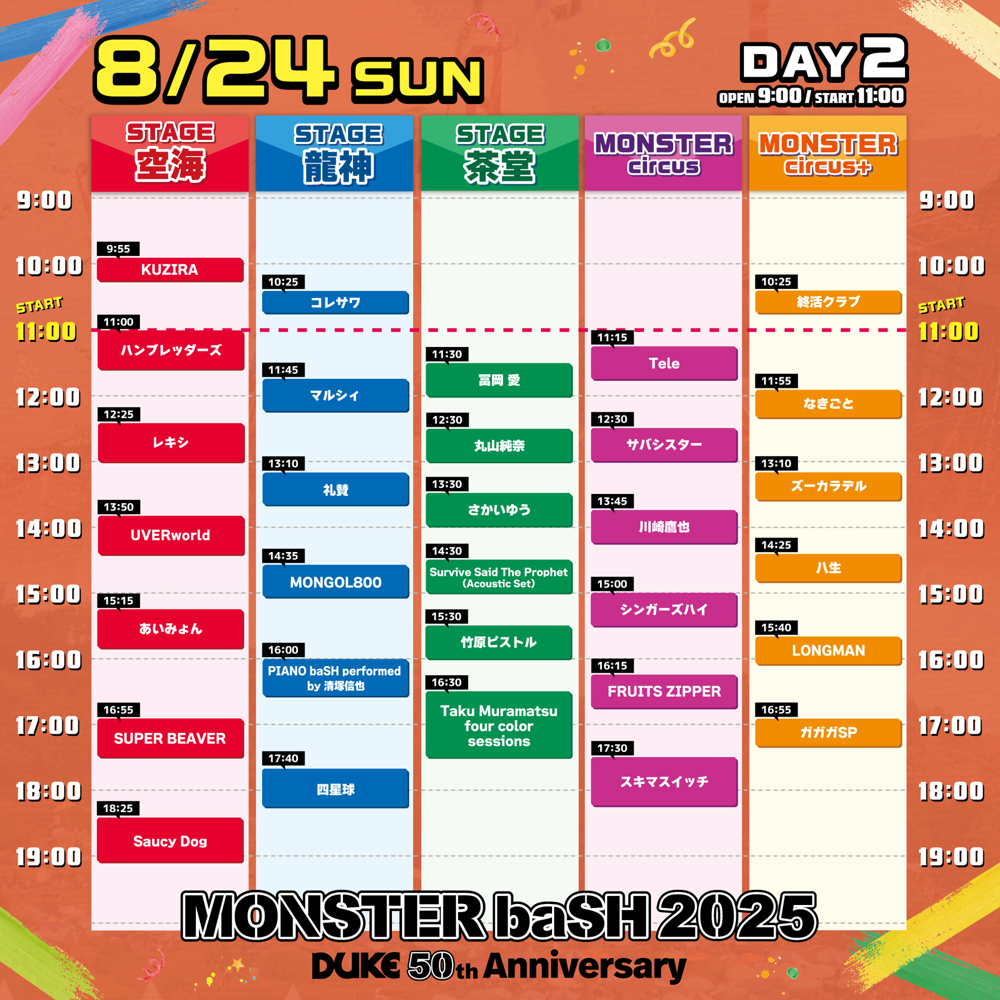 8月23日(土)、24日(日)に香川・国営讃岐まんのう公園にて開催される、中四国最大級の野外ロックフェス『MONSTER baSH 2025 DUKE 50th ANNIVERSARY』のタイムテーブルが発表された。