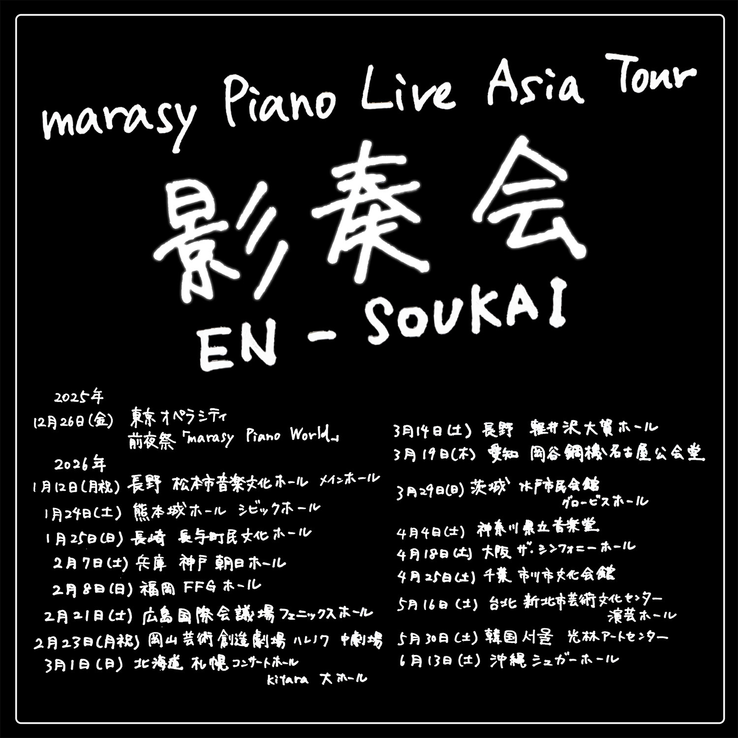 ピアニスト・まらしぃが、アジアツアー『marasy Piano Live Asia Tour 影奏会 EN-SOUKAI』を2025年12月下旬より開催することを発表した。