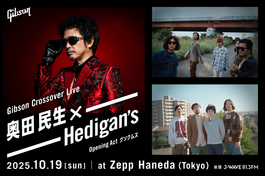 『Gibson Crossover Live』は、ギブソン・ブランズ・ジャパンが主催するライブイベント。これまでに、ギブソン・アンバサダーの奥田民生がバンド編成のMTR&Yとして登場することと、Suchmosの河西“YONCE”洋介を擁するHedigan’sの出演が発表されていた。