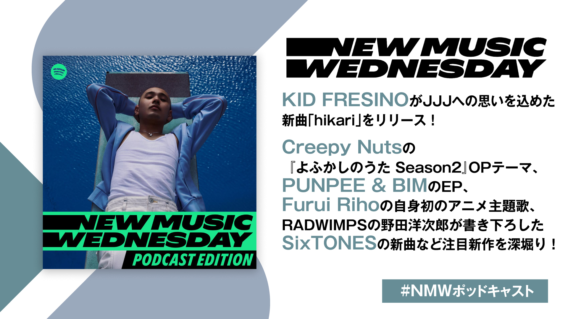 今週はKID FRESINOがJJJへの思いを込めた新曲「hikari」をリリース! Creepy Nutsの『よふかしのうた Season2』OPテーマ、PUNPEE & BIMによるEP、Furui Rihoが自身初のアニメ主題歌を務めた新曲、RADWIMPSの野田洋次郎が書き下ろしたSixTONES の新曲もピックアップ&この1週間の気になる音楽ニュースも深堀り! アーティストのライブやフェス情報も掲載しているので要チェックだ。番組への感想やリクエストはSpotifyアプリのコメント機能から投稿を。
