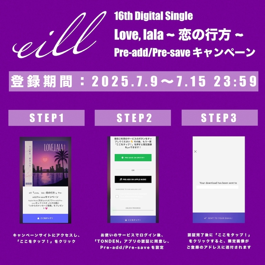 また、本日・7月9日(水)から「Love, lala ~恋の行方~」Pre-Add & Pre-Save キャンペーンがスタート。Apple Musicの“Pre-Add”、Spotifyの“Pre-Save”いずれかに指定のURLから登録した人に、限定画像がプレゼントされる。詳細はeillオフィシャルSNSやHPをチェックしよう。