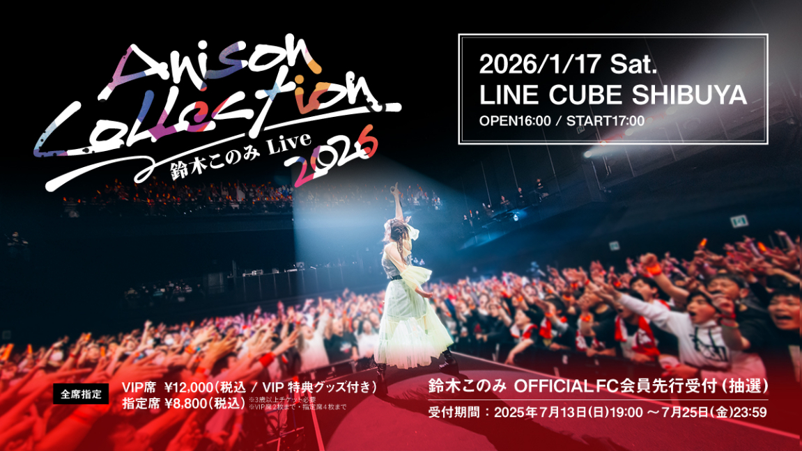 鈴木このみが自身初のアニソンオンリーライブ『鈴木このみ Live 2026 ~Anison Collection~』を2026年1月17日(土)に東京・LINE CUBE SHIBUYAで開催することがわかった。