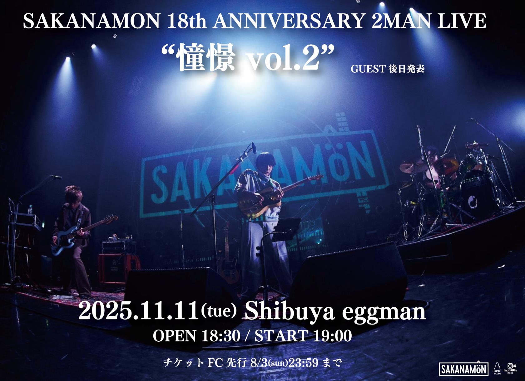 SAKANAMONが、バンドの結成日にあたる11月11日(火)に『SAKANAMON 18th ANNIVERSARY 2MAN LIVE“憧憬 vol.2”』を開催すると発表した。