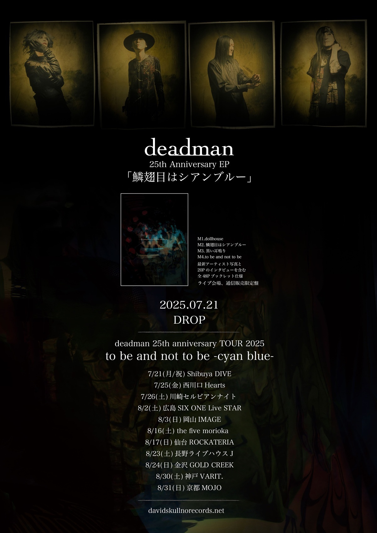 結成25周年ツアーを行なっているのdeadmanが、aie(Gt)の誕生日である9月26日に新宿LOFTでのツアー追加公演と、12月21日に大手町三井ホールにて「25周年イヤー」のグランドファイナル公演『deadman 25th anniversary TOUR 2025 「to be and not to be final -被覆する造形は人、腫れる風船の奇病-」』の開催を発表した。