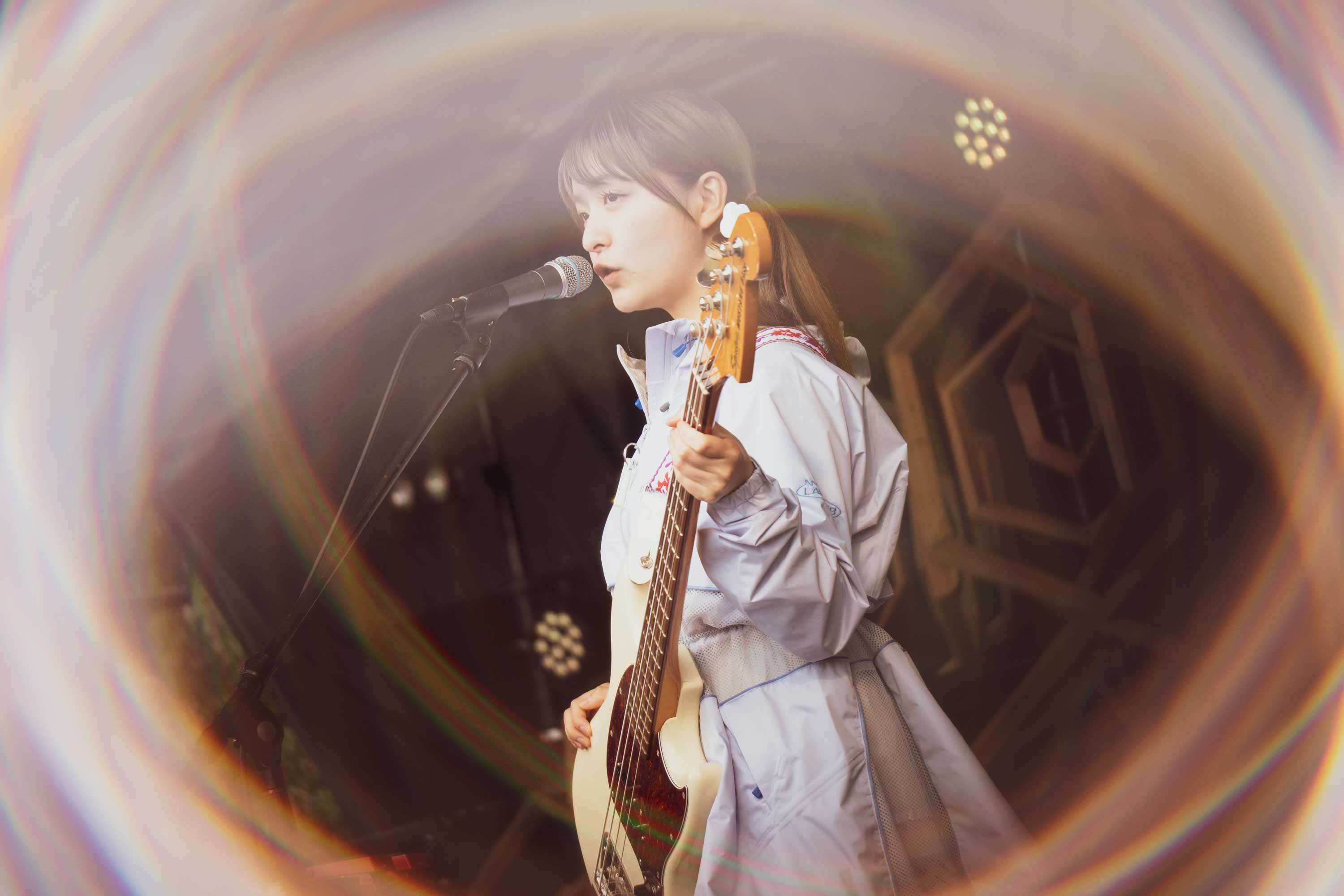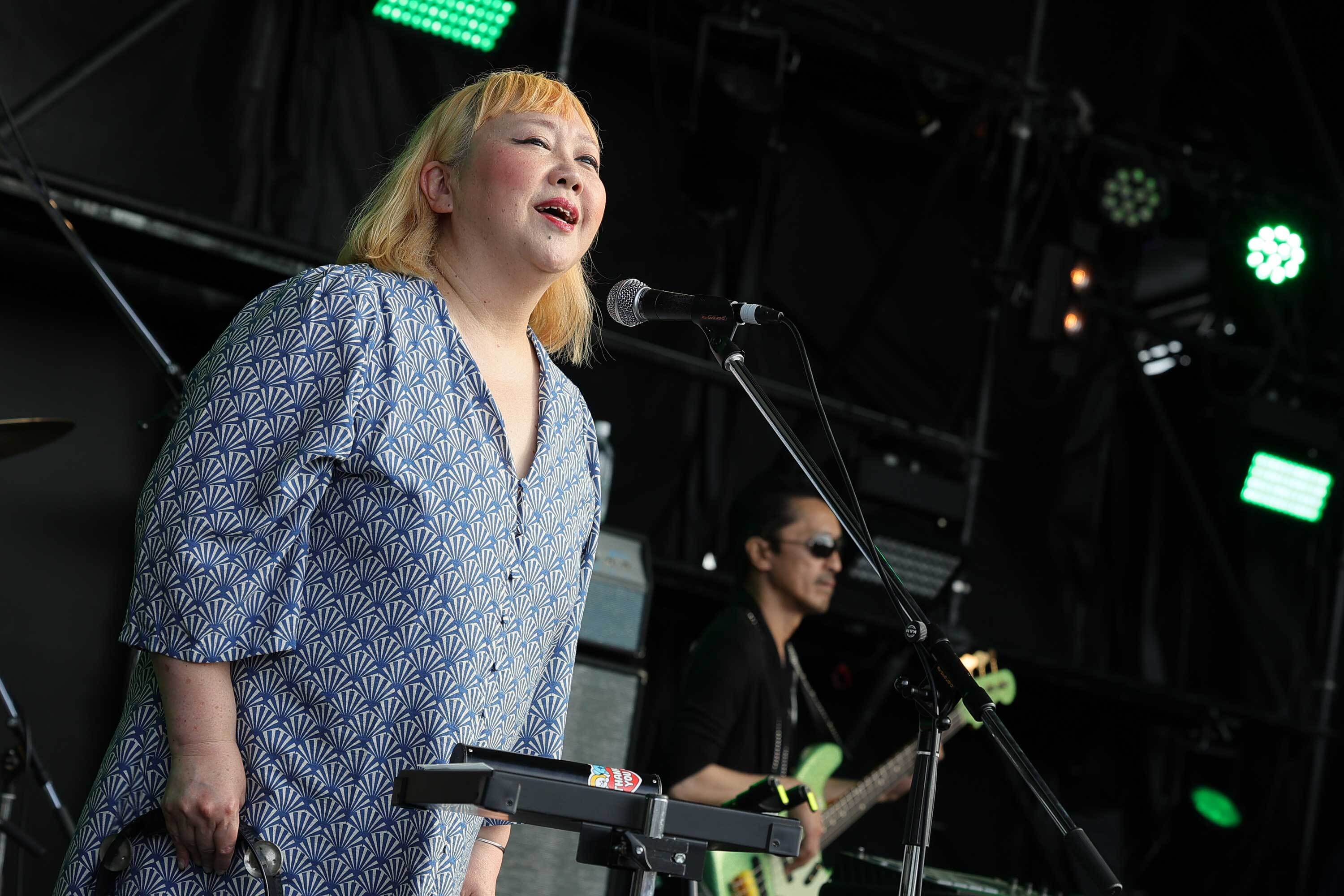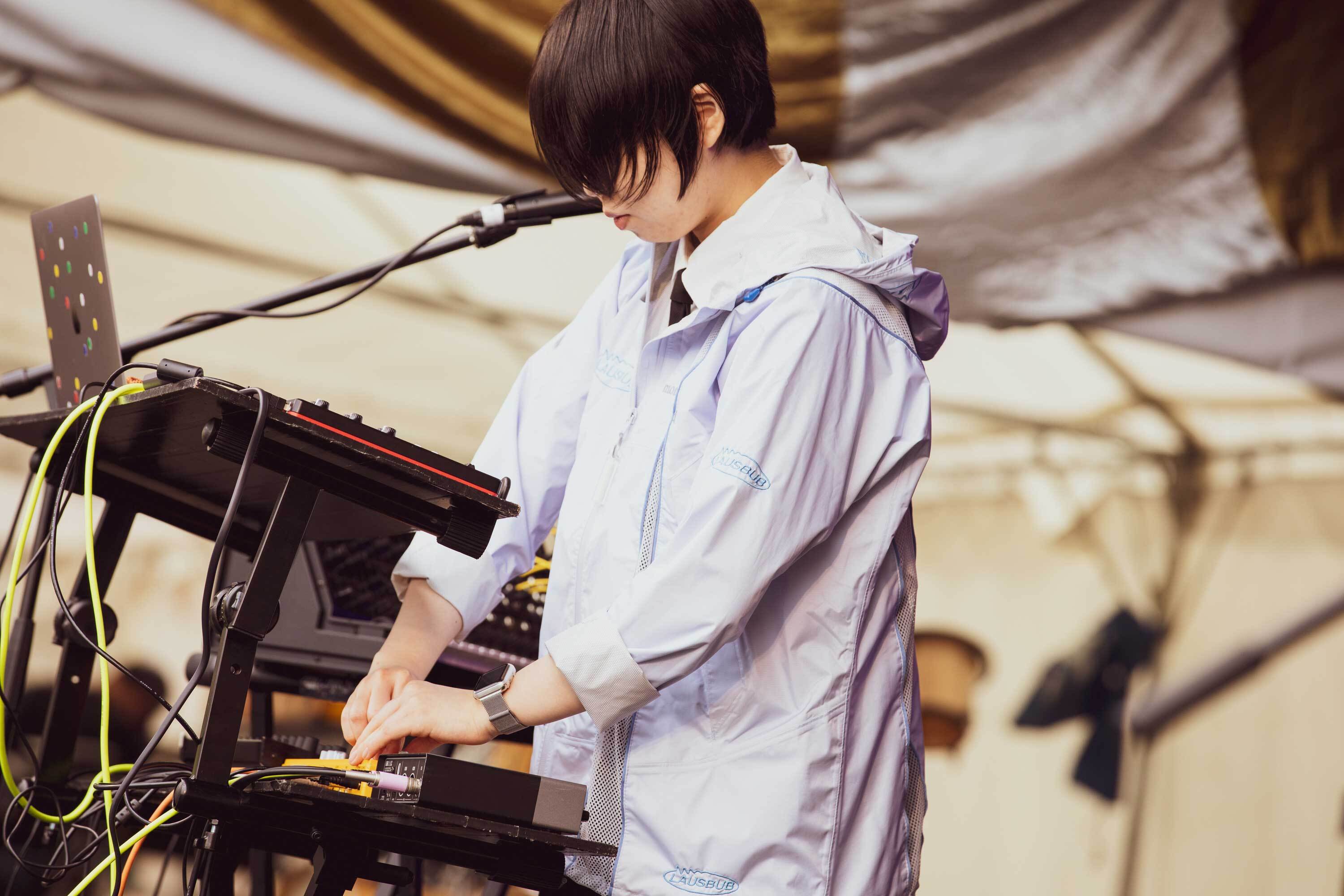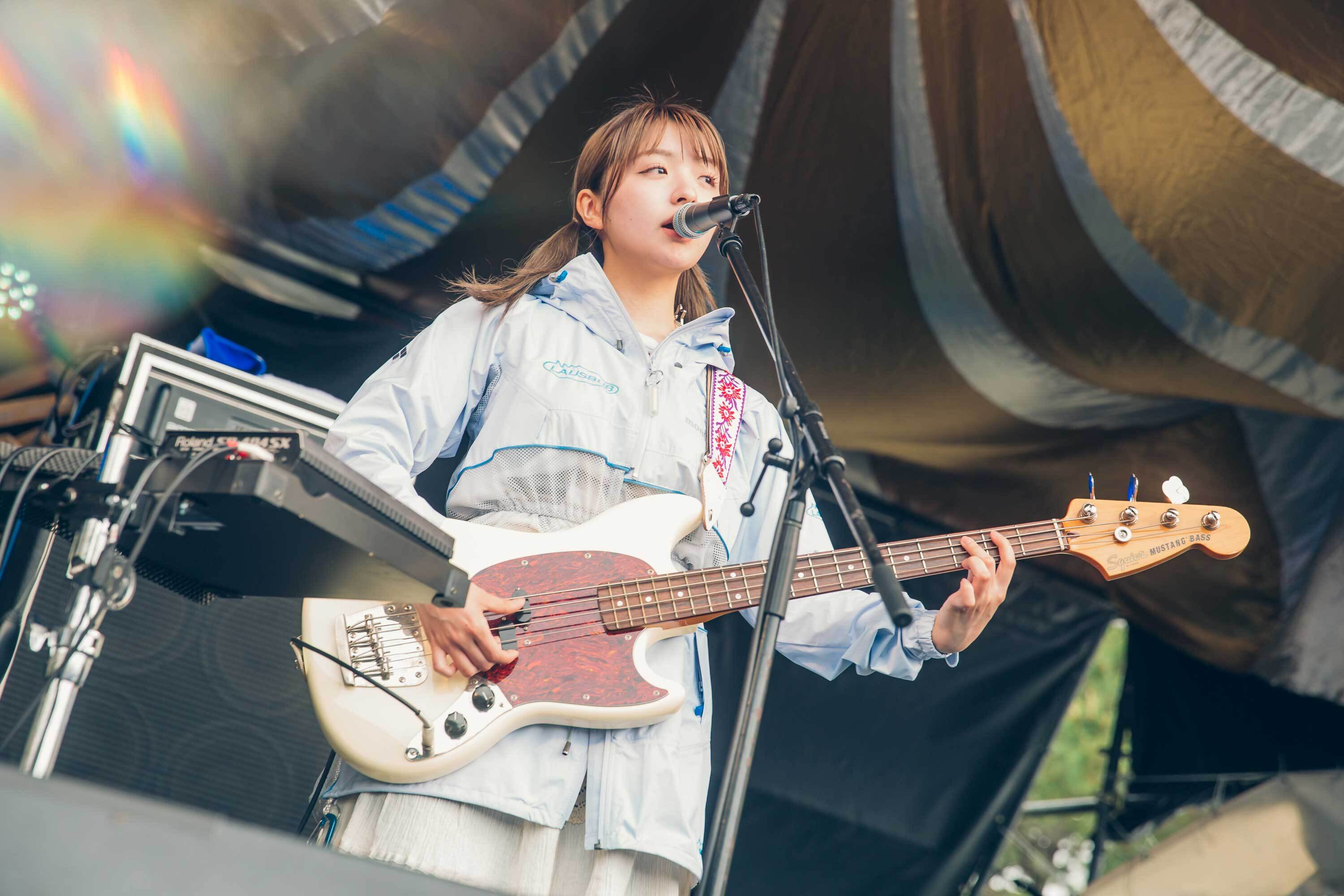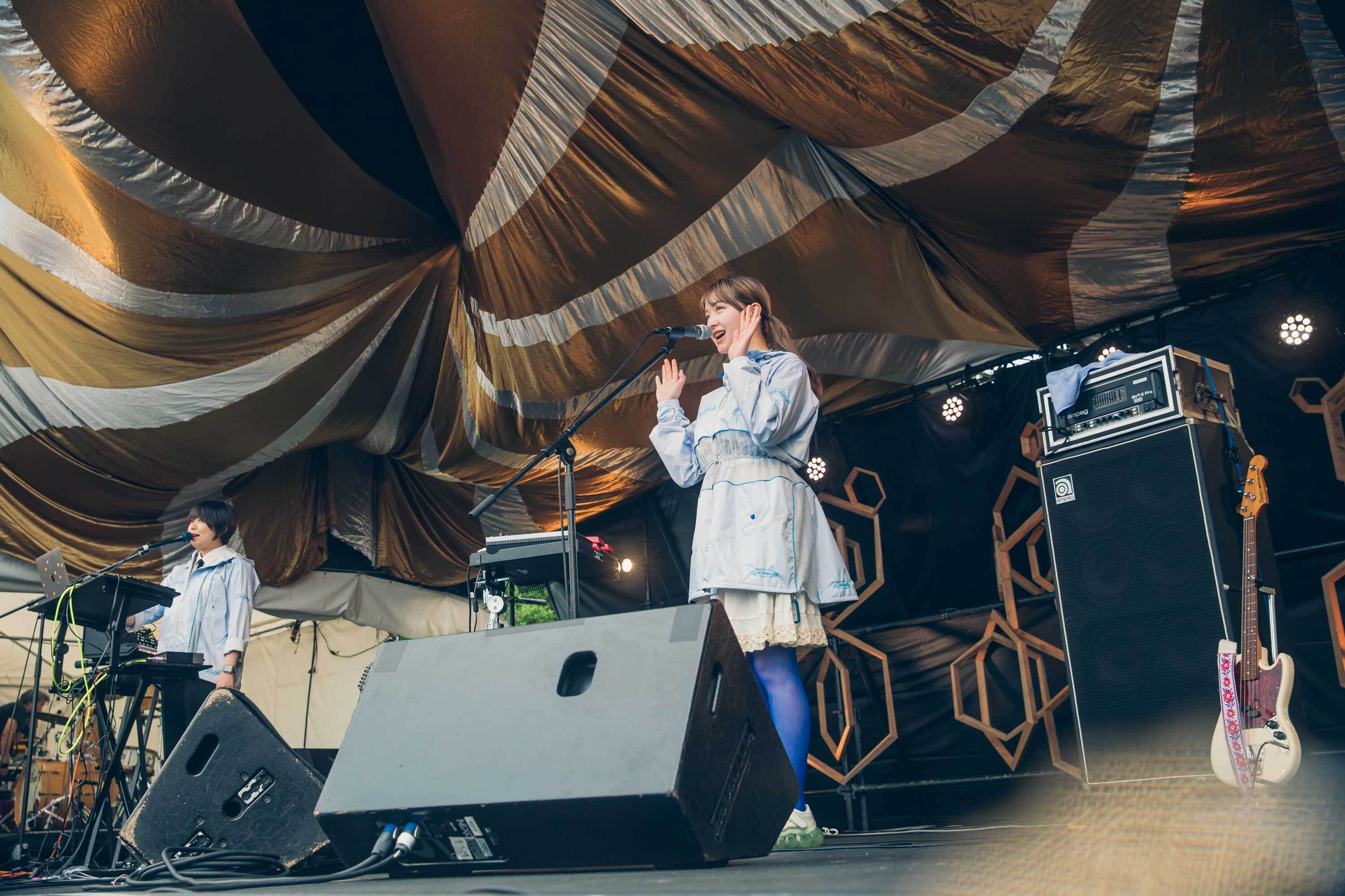 その横にあるKOAGARI STAGEのトップバッターで登場したのは、Answer to Rememberと同様に初福岡となる北海道出身のLAUSBUB。ギターとシンセサイザーとマニピュレーションを務める岩井莉子と、ボーカルとベースを務める髙橋芽以による2人組。ニューウェーブを感じさせるテクノポップを鳴らすが、真昼間から聴くダンスビートには、心身共にとろけてしまう。