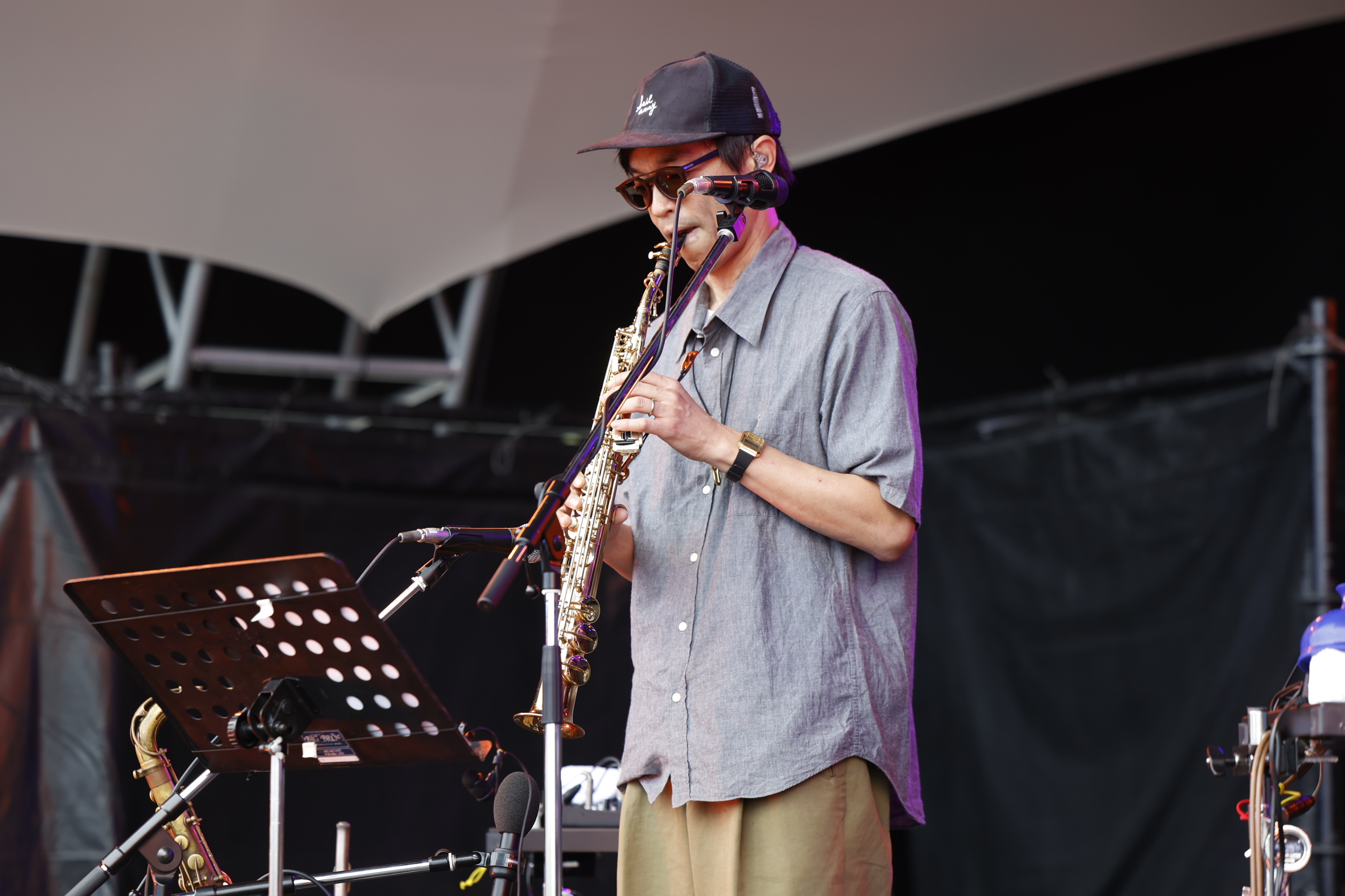 さぁ、CIRCLE STAGEに戻ろう。CIRCLE STAGE 2番手のSTUTSは、仰木亮彦(G)・武嶋聡(Sax.Flu)・佐瀬悠輔(Tp)という4人編成。この編成で舞台に上がるのは初めてだと言う。佐瀬は既にAnswer to Rememberとして舞台に上がっており、このようにサポートメンバーが舞台を掛け持ちしている姿を『CIRCLE』で見かけることが多い。ただただ個々の出演者ではなく、それこそ『CIRCLE』ではないが、出演者たちが円のように繋がっているのも良い。