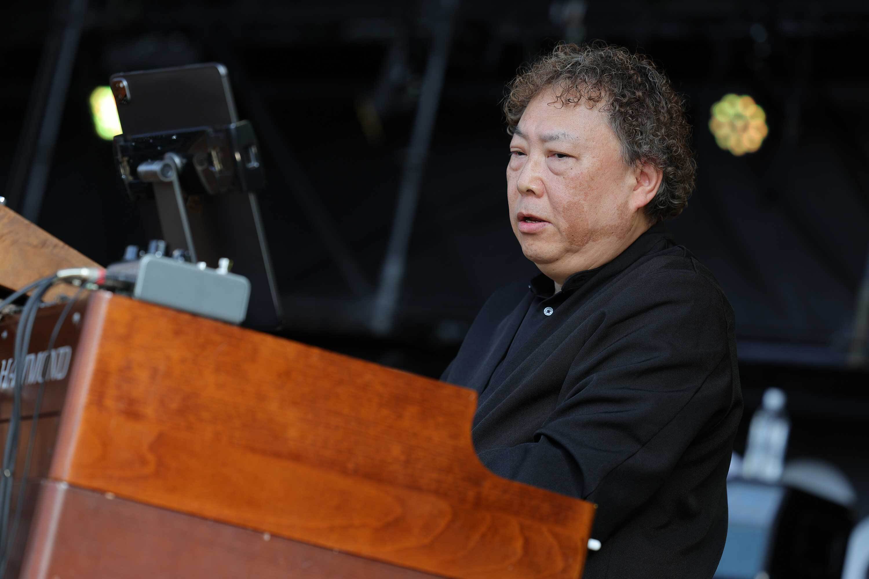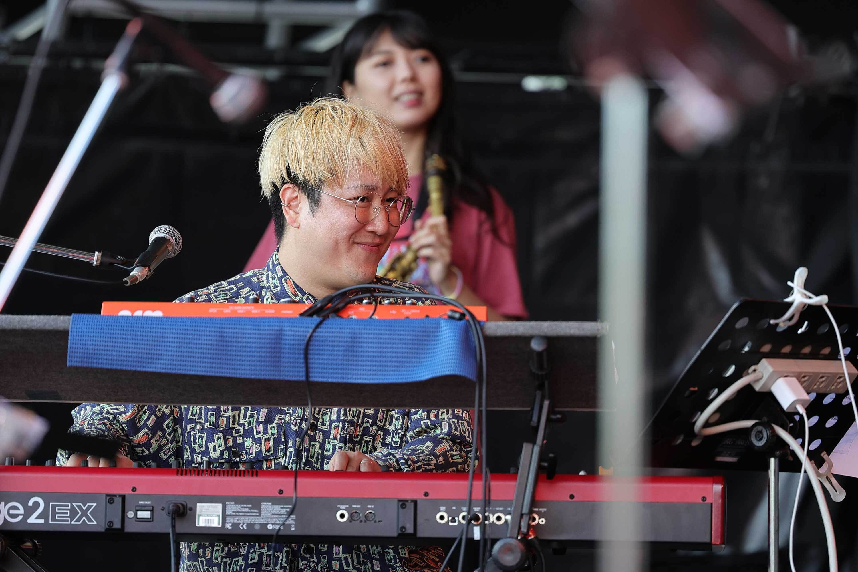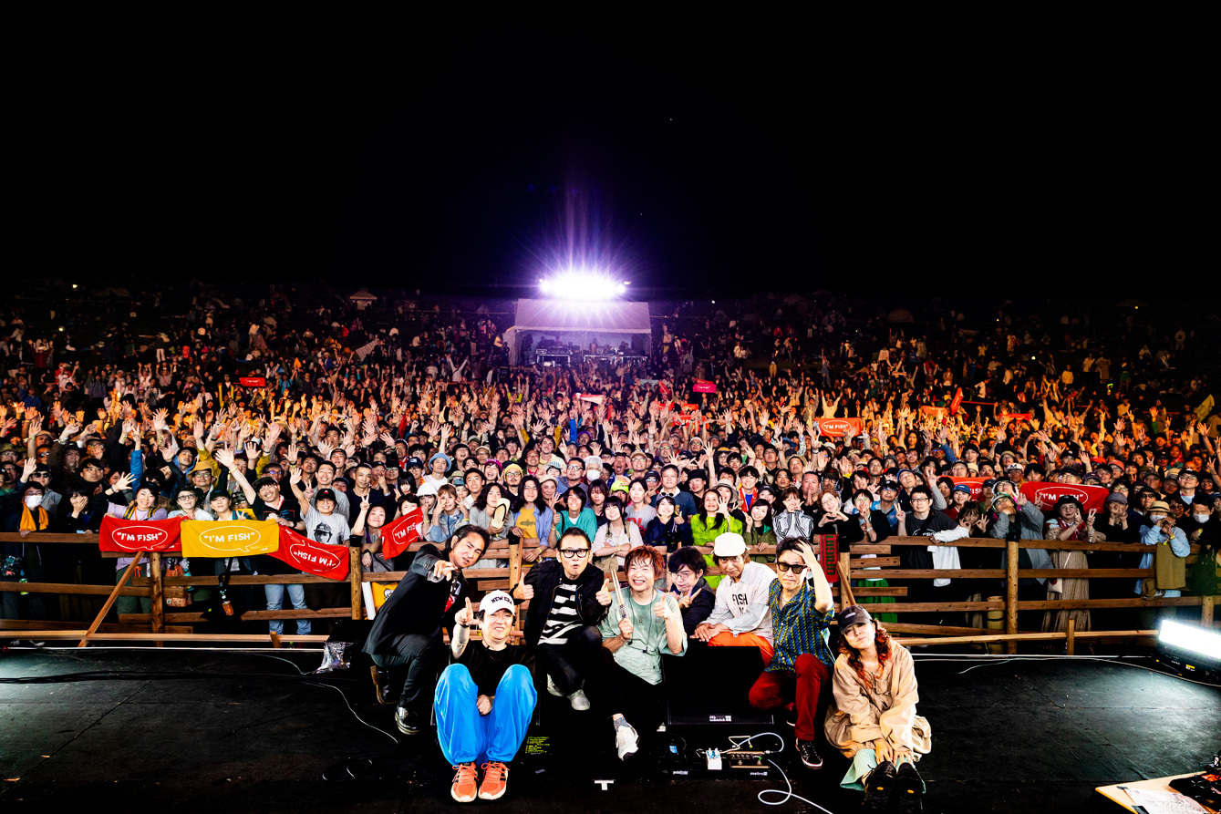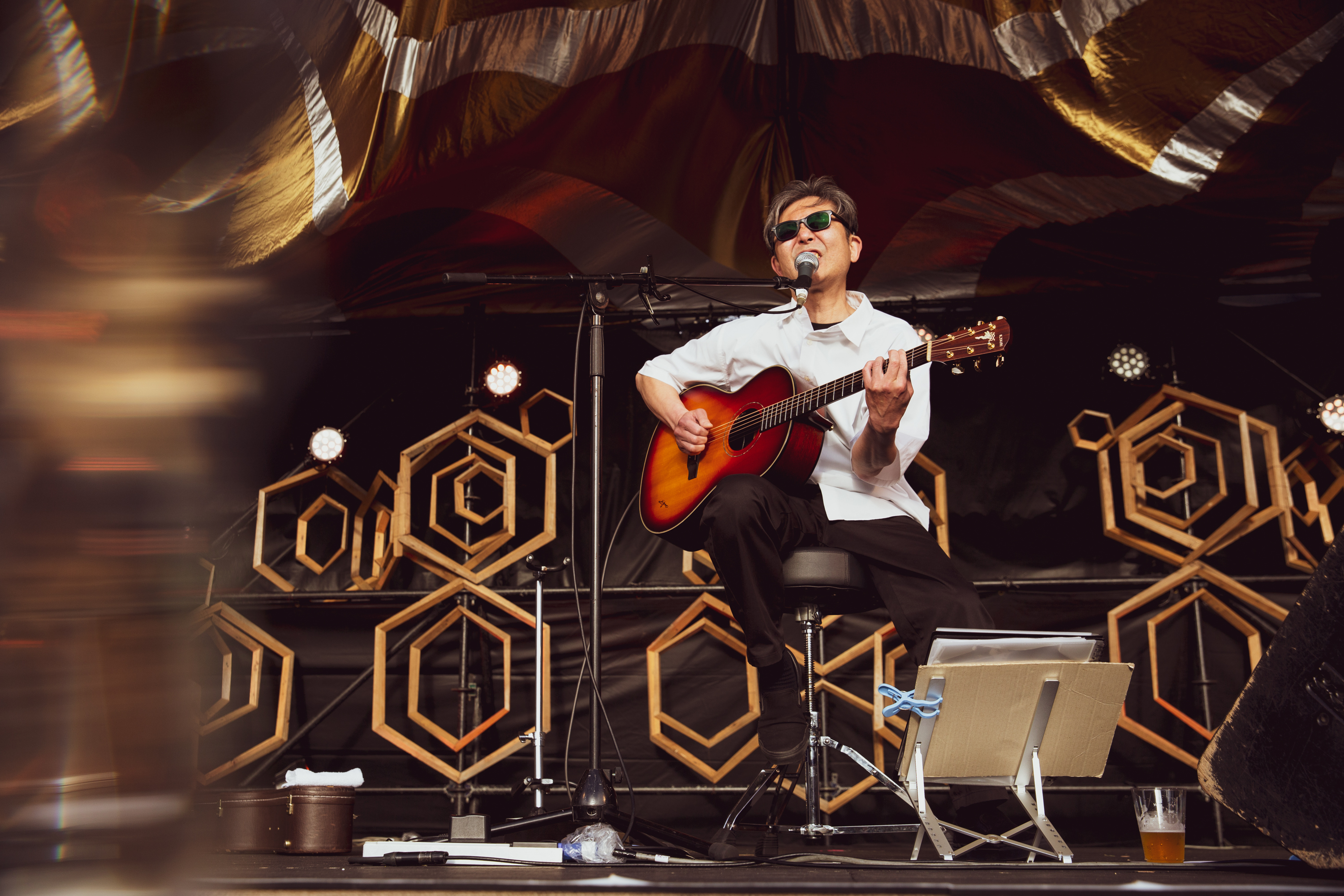 翌日に自身の出番も控える君島大空が呼び込まれ、「BABY BLUE」のメロディーをギターで爪弾く。既に今年2月の東京でのライブにもボーカルで参加しているだけあって、相性が抜群である。若い世代のミュージシャンにもフィッシュマンズが歌い継がれるのは幸せなことである。舞台にかぶりついて観ている人々も後ろのすり鉢状の芝生でゆっくり観ている人も皆が幸せそうである。そして、地元福岡出身の原田が「頼りない天使」を歌い、東京でも関西でも歌った事が無い初めてフィッシュマンズを歌うスペシャルゲストが登場! 先程、自身のライブを終えたばかりの田島貴男が現れる。浮遊感あるフィッシュマンズの歌を、田島が豪快にソウルフルシャウトするのは、とてつもない化学反応が起きて胸騒ぎが止まらない。