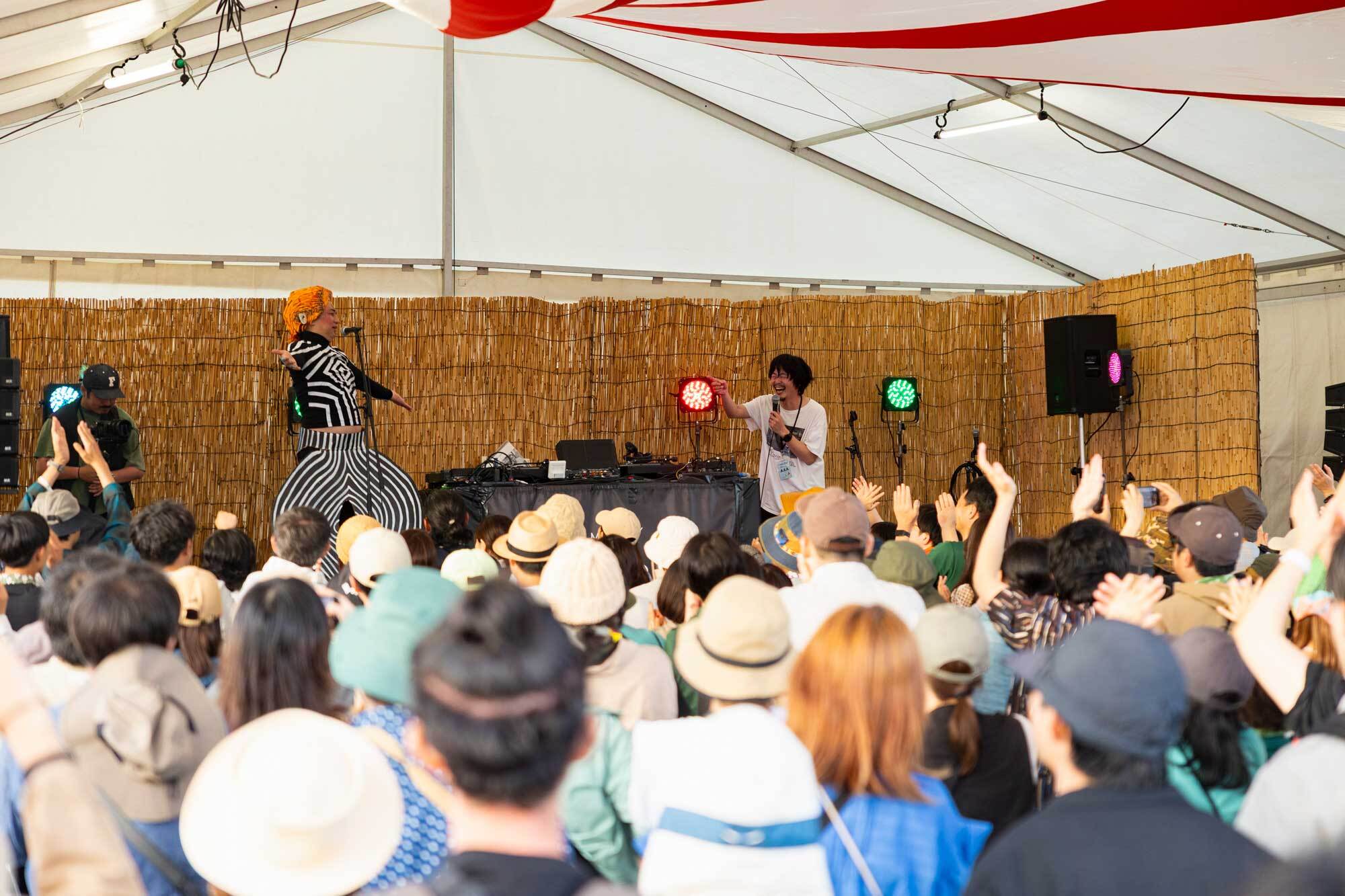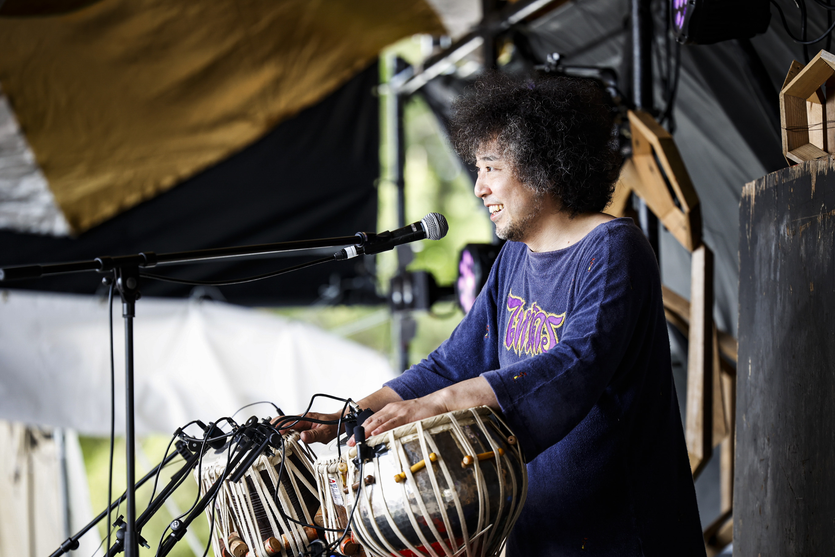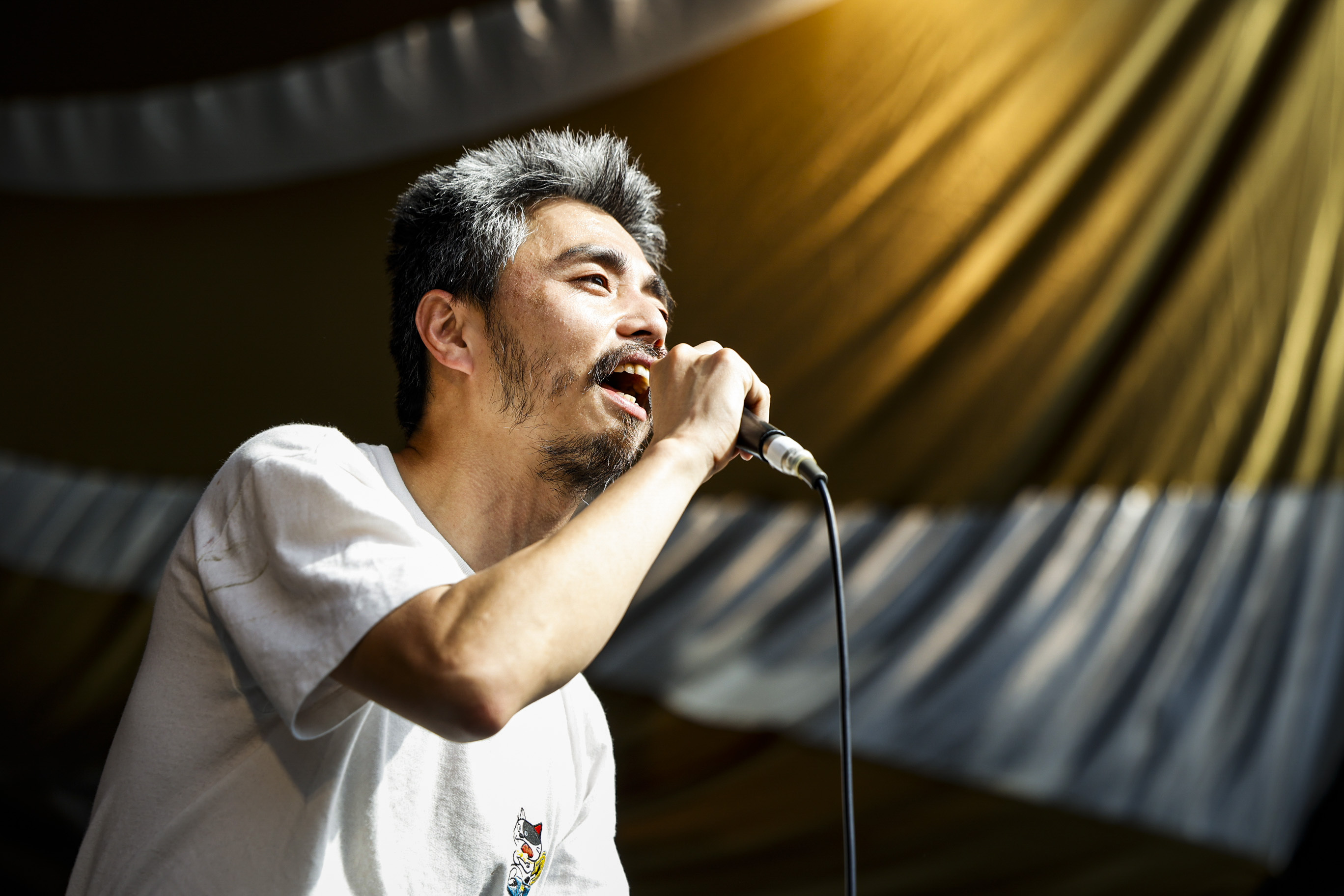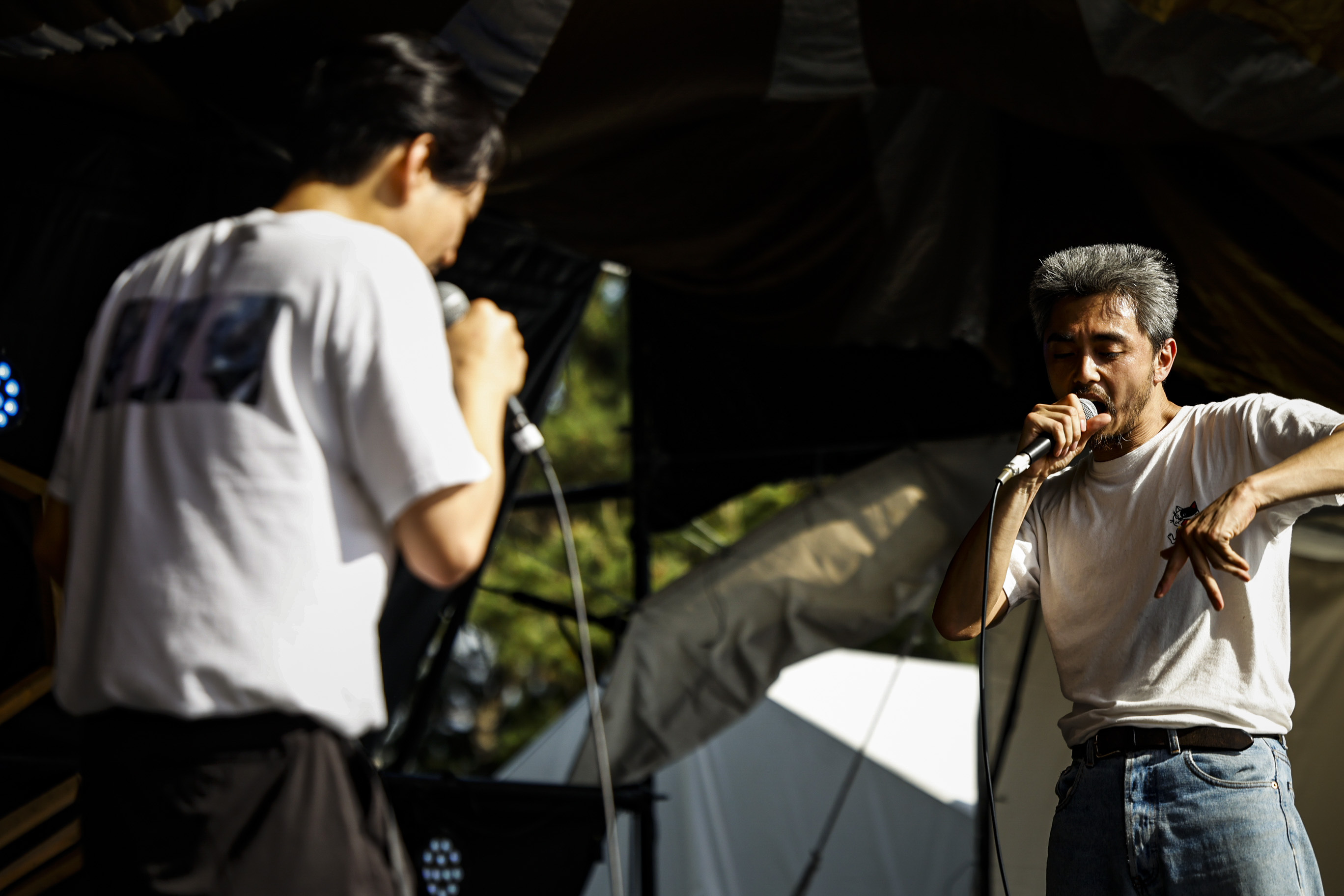 この流れで、KOAGARI STAGEの3番手は、3人という座組では初出演となるU-zhaan×環ROY×鎮座DOPENESS。環ROY・鎮座DOPENESSより一段高いところでインドの太鼓の一種であるタブラを叩くU-zhaan。ふたりがフリースタイルで即興ラップをする場では、何回かやり直したり、初日ヘッドライナーであるフィッシュマンズの「宇宙 日本 海中」と題されたステージ名が飛び出たり、2日目ヘッドライナーであるUAの「リズム」がカバーされたり、その自由な型が観ていて楽しくて仕方ない。