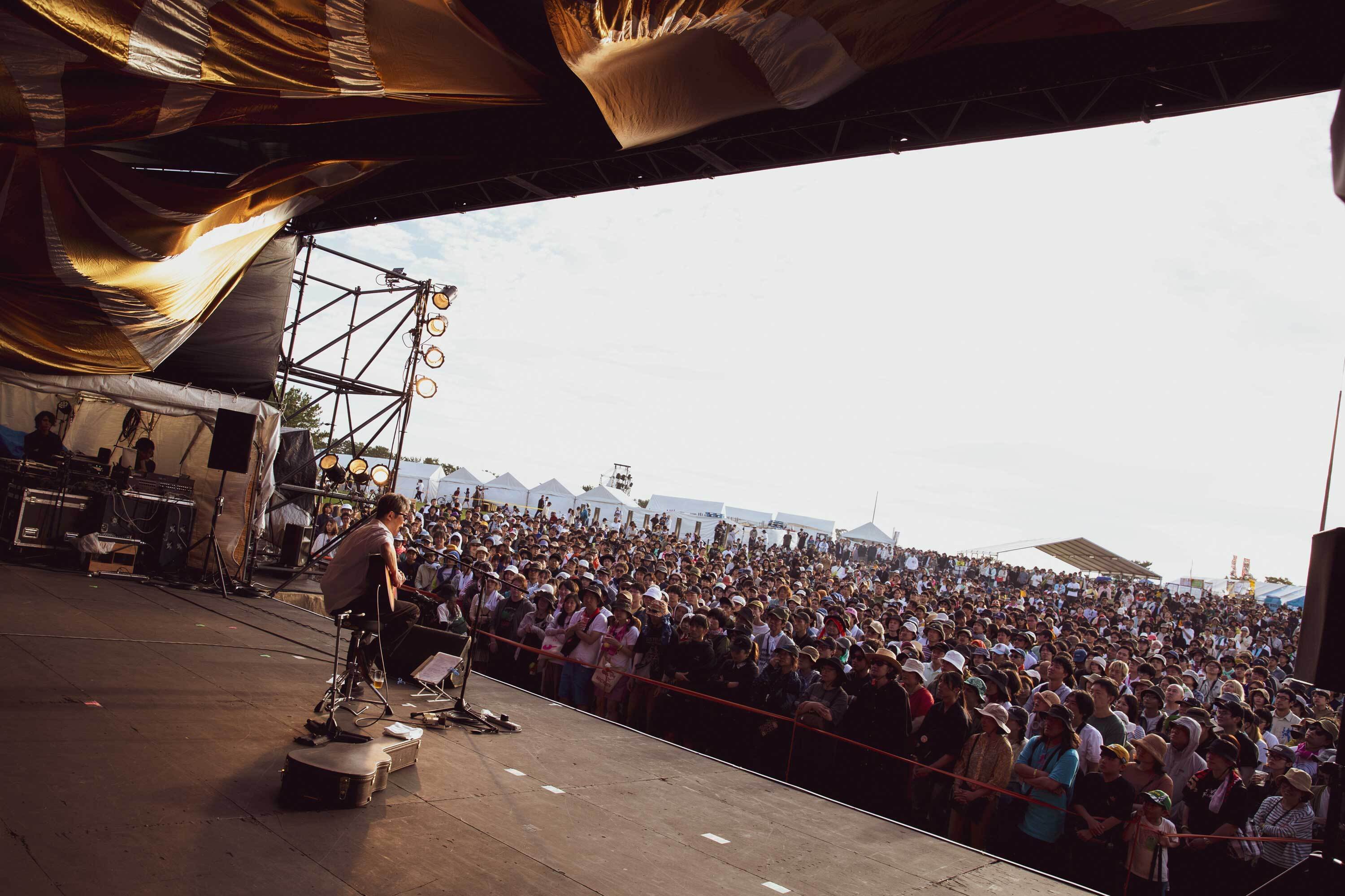当たり前だが、野外ではあるので、その安心感は天気に大きく左右される。福岡を拠点に活動するラジオパーソナリティの栗田善太郎がCIRCLE STAGEで前説として挨拶をした時に、「晴れた~!」と思わず叫んでいた。今年は何よりも、このひとことに尽きる。関西在住の私も1週間以上前から天気予報とにらめっこをしていたが、両日共に雨というか大雨の予報だった。多くの人が大雨に挑む気持ちで入念な大雨対策準備をしていたであろう。それが杞憂に終わったのである。特に初日はピーカンと言って良いほどの大晴天に。『CIRCLE』のライブレポートは4回目の担当となるが、今年も出演者全組を詳細に記録するレポートというよりは、私の膨らんだ記憶を辿りながら、全体的に感じたことを綴る紀行文だと思って読んでいただけたらと思います。