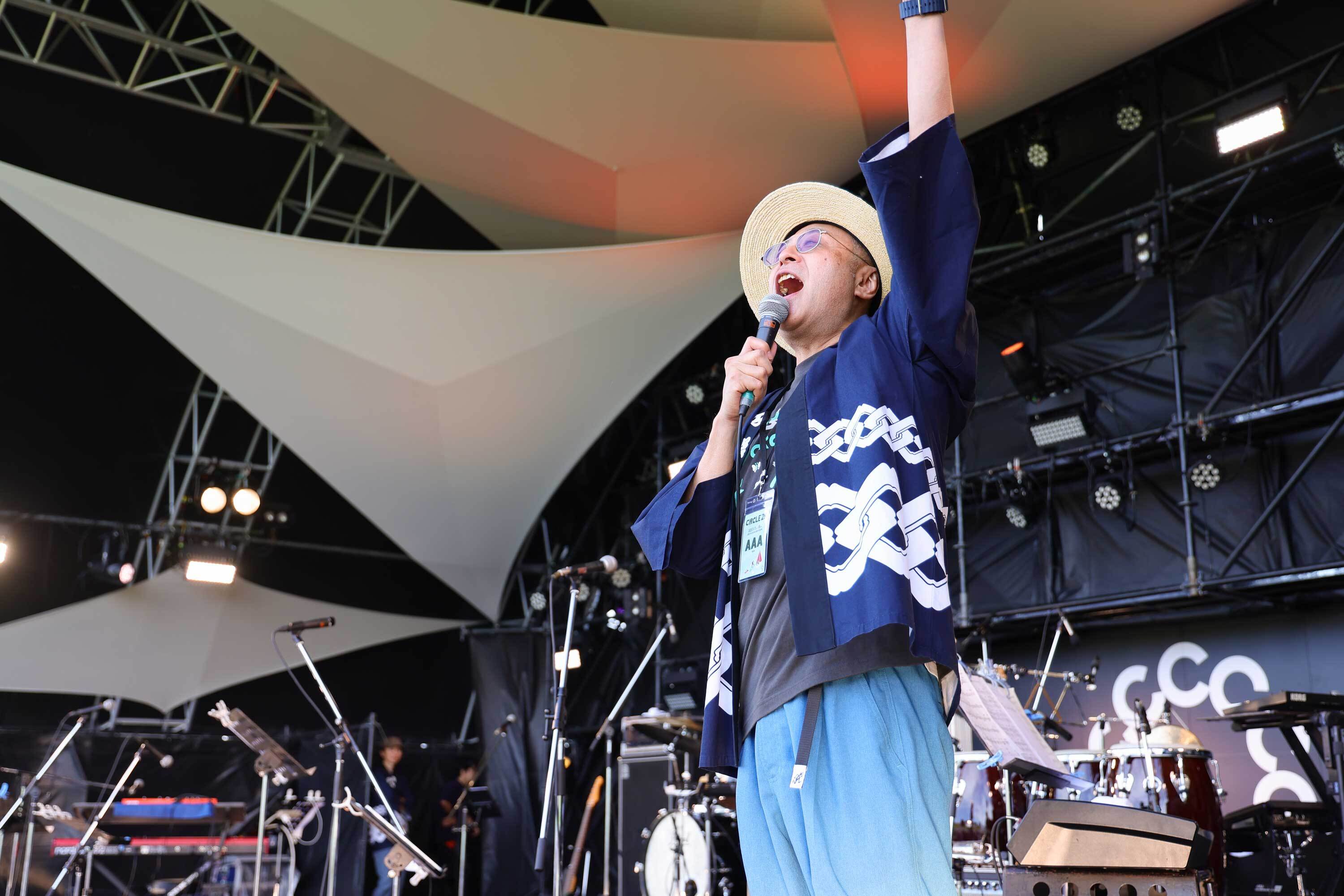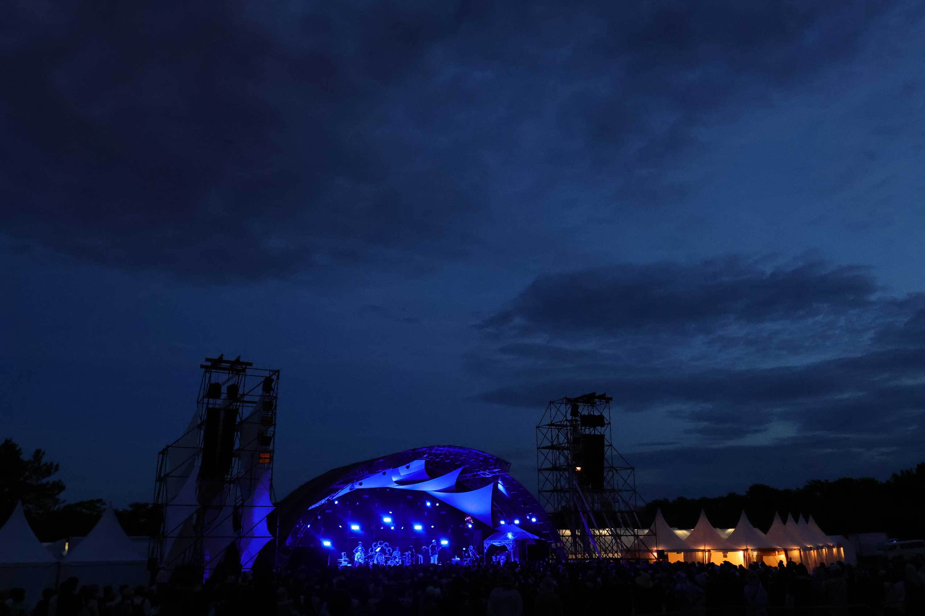 ラストはボーカル全員が集って「ナイトクルージング」。すっかり夜になった時間に、これ以上ない曲。舞台から凄い光と凄い音が解き放たれていて、その空間で我々はゆらめくのみ。拍手は鳴りやまない。90分を超えて100分近くあった「宇宙 日本 海中」。こうして初日が幕を閉じて、2日目と繋がれていく。