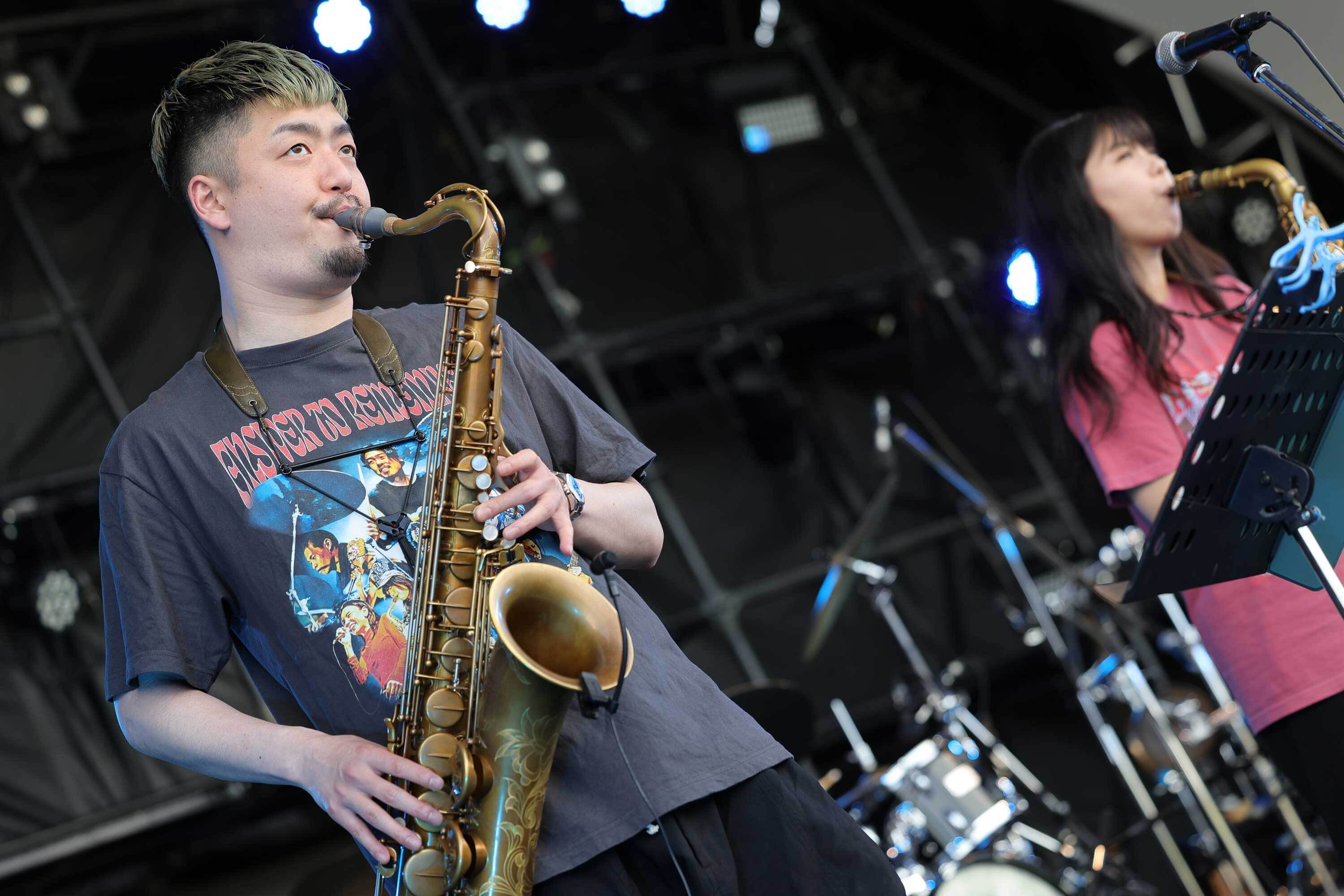 11時・CIRCLE STAGEには、去年はくるりのサポートドラムとしても出演していた石若駿率いるAnswer to Rememberがトップバッターで登場。佐瀬悠輔(Tp)・MELRAW(As、Gt)・中島朱葉(As)・馬場智章(Ts)、若井優也(P.Key)・海堀弘太(P.Key)・マーティ・ホロベック(Ba)・Taikimen(Per)という大所帯バンド。即興のように鳴らされる演奏は超絶で、これだけの大所帯を観られるのは貴重だと思っていたら、やはり初めての九州でのライブとのこと。