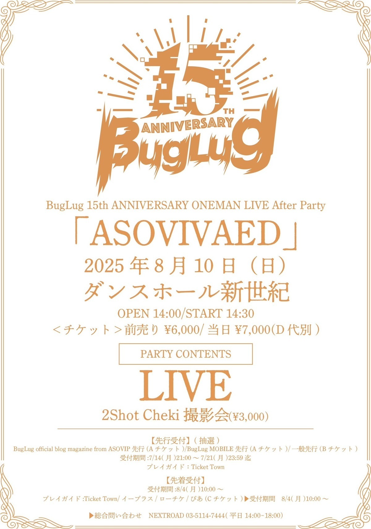 翌8月10日(日)には、東京・ダンスホール新世紀にてアフターパーティ『ASOVIVAED』も開催。撮影会付きのイベントとして、前日の公演を振り返りながらファンとの交流を深める機会が用意されている。
