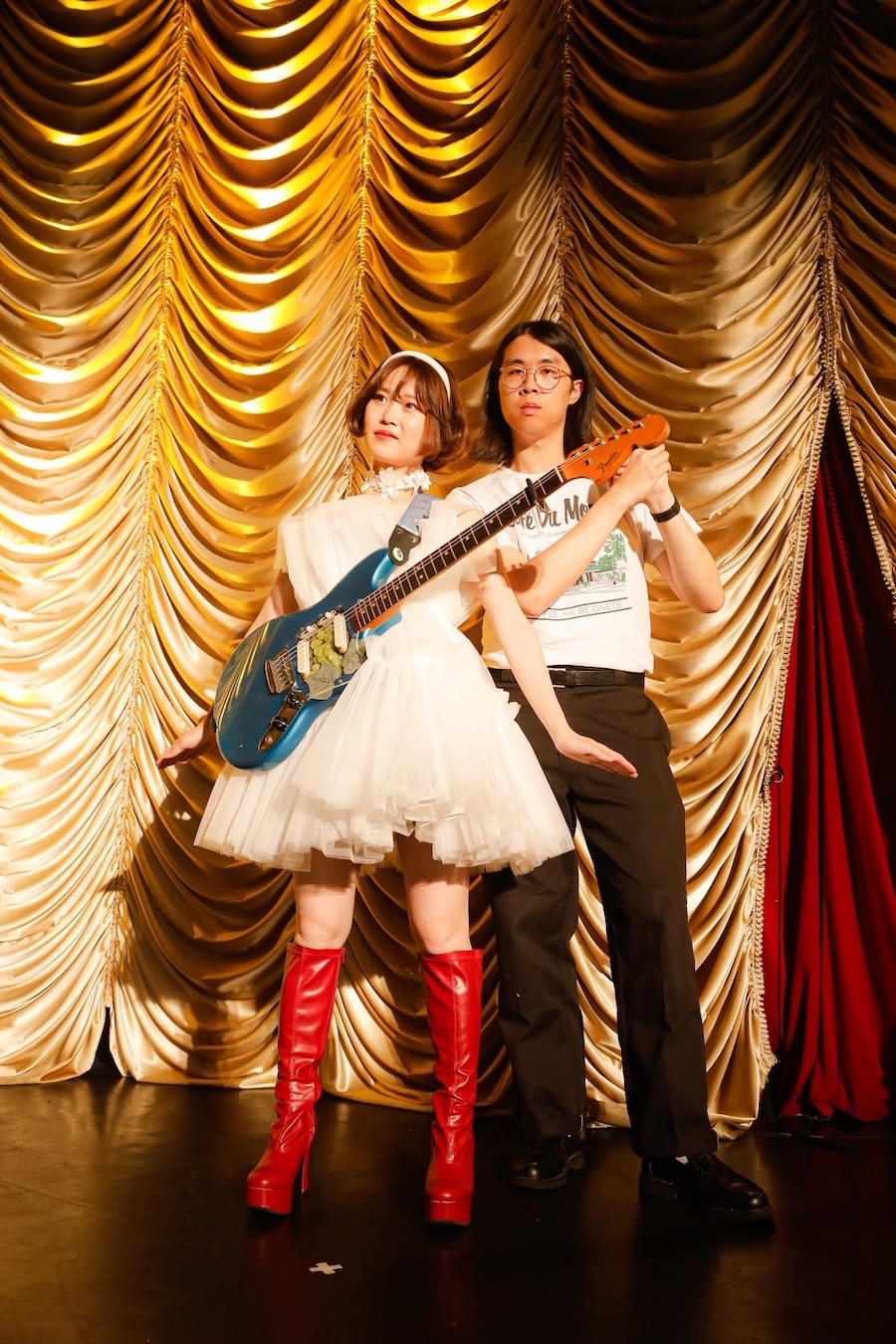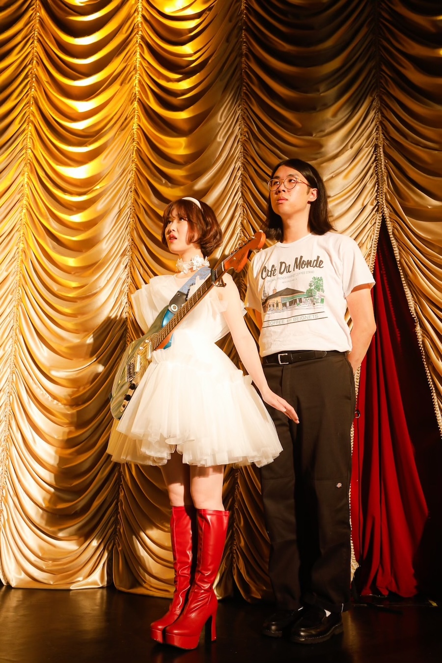 簡単に説明しておくと、Ginger Rootは南カリフォルニアのオレンジカウンティ出身ミュージシャンであるキャメロン・ルーのプロジェクト。彼はマルチインストゥルメンタリスト、プロデューサー、ソングライター、ビデオグラファーとして幅広く活躍し、2010年代の終わり頃から早耳の音楽ファンの間で注目される存在だったが、2023年のフジロックの深夜にアイデア満載のパフォーマンスを見せたことでライブの面白さが評判になり、3rdアルバム『SHINBANGUMI』を携えた昨年6月の2度目の日本ツアー(Zepp DiverCityほか)は完売に。今月のフジロックにも2度目の出演が決まっている。そんな彼はかつて(架空の)80年代の日本のアイドルのために楽曲を書き、プロデュースするよう依頼されたというコンセプトの元でいくつかの曲とMVを発表していたが、それに近いコンセプトを今回のライブにも採用。「80年代に彗星の如くデビューして人気を博したアイドル=Reiが活動期間1年足らずで電撃引退するも、たった1枚残したシングル“Love is Beautiful”がマニアの間で幻のコレクターズアイテムに。そして今、オレンジカウンティ出身のシンガー・ソングライターである青年=キャメロンがそのシングルを探して東京を駆けまわっていた」という設定で、ふたりの生共演が初実現したのだった。