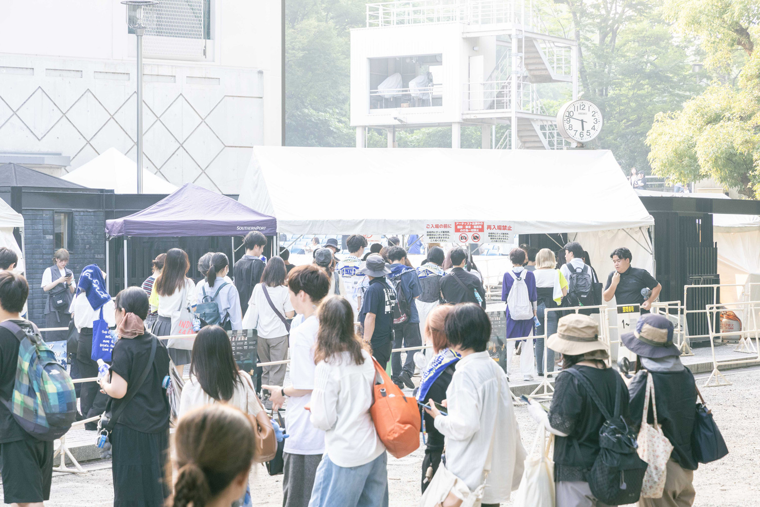 同イベントに向け、indigo la Endの川谷絵音(Vo.Gt)× Omoinotakeの藤井怜央(Vo.Key)のスペシャル対談(https://spice.eplus.jp/articles/337783)が事前に実施され、ライブ当日のバックヤードには兵庫県に住んだことがあるという藤井の思い出の味、ラーメン神戸たろうの「たろうの白菜キムチ」がケータリングで用意されるなど、おもてなしの姿勢もバッチリで初対バンの2組をお出迎え。イベントオリジナルのタオルやクリアステッカー(現在はGREENS公式オンラインショップで購入可)はもちろん、限定ドリンク「サンセットカクテル」や「サンセットサイダー」も販売され、ひと足早い常夏ムードが訪れるなか、年に一度の祝祭が幕を開けた。