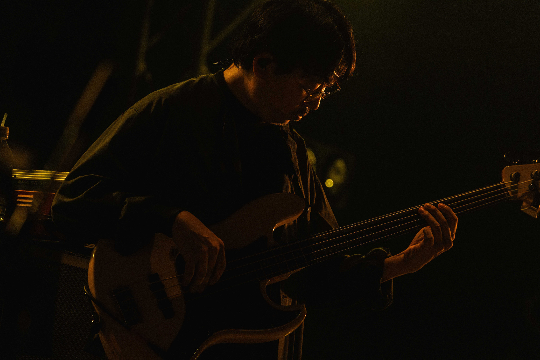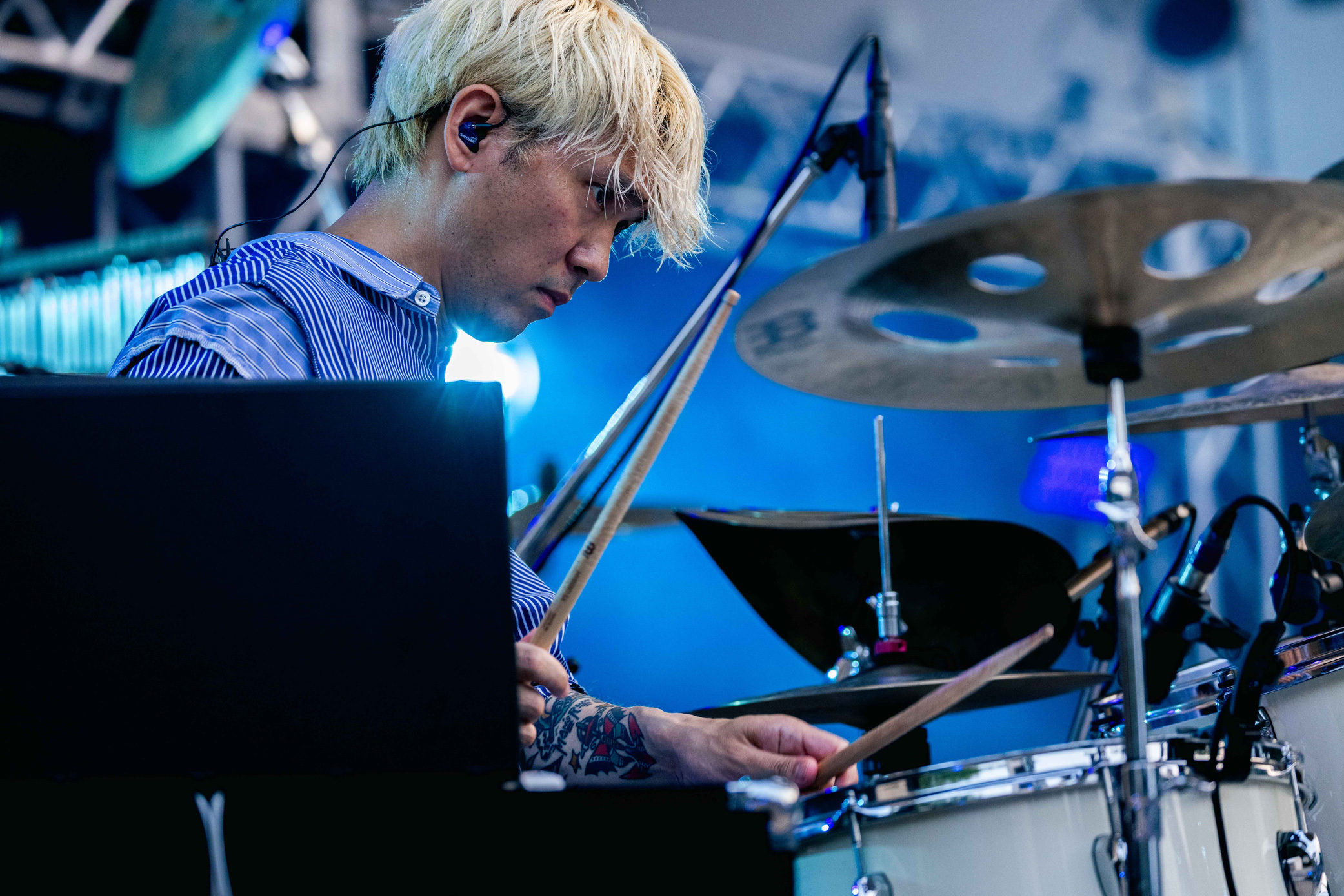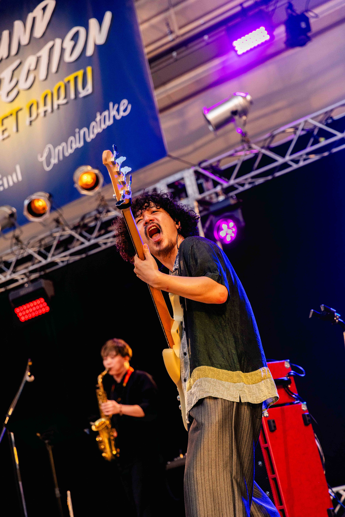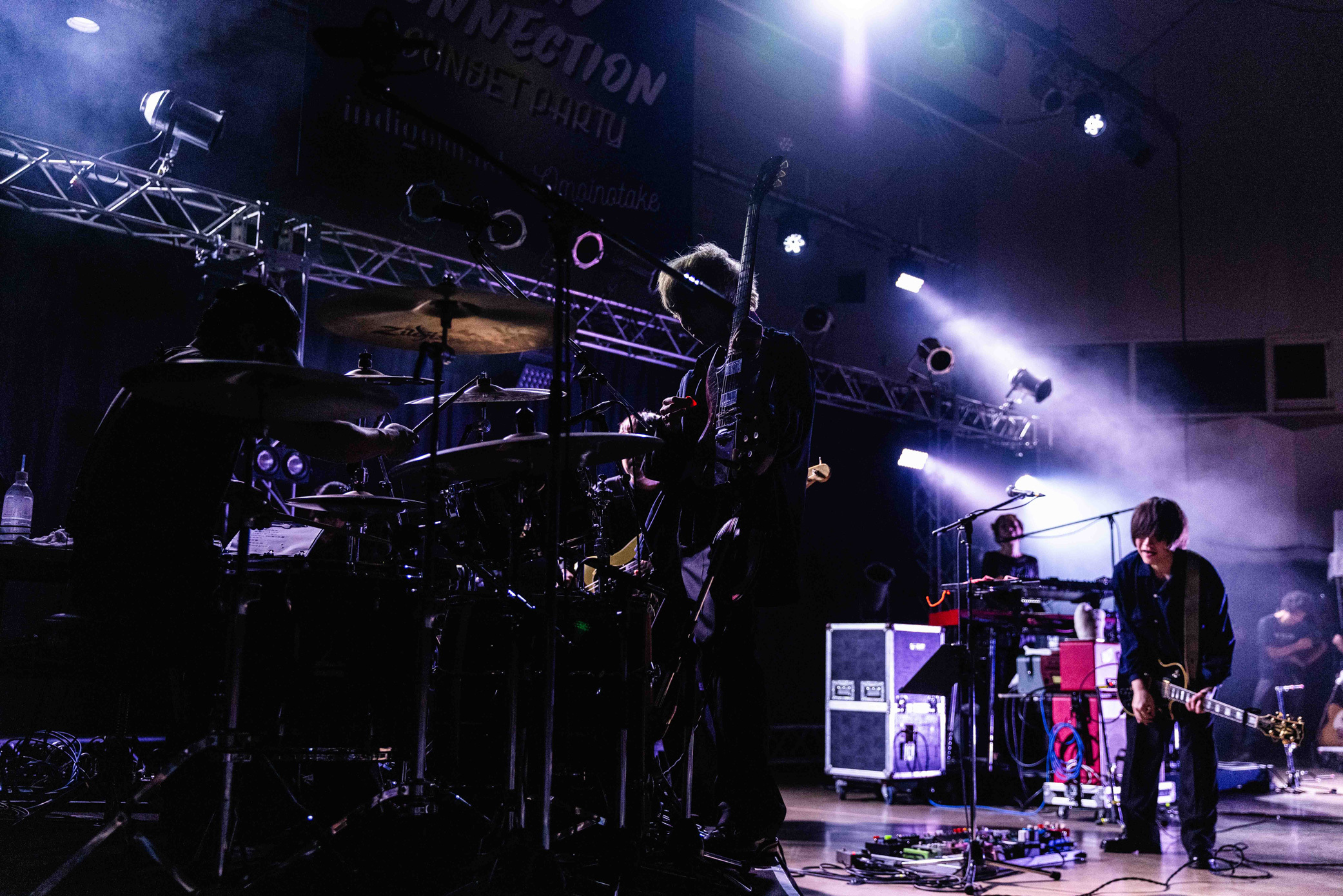 フレーズの端々から美学を感じる「たまゆら」でもはかなき轟音で見る者を圧倒し、浮遊感のある女性コーラスと後鳥亮介(Ba)のうねるベースラインが導いた「魅せ者」では、長田カーティス(Gt)の流麗かつ不穏なギターや佐藤栄太郎(Dr)のカオティックなドラムでも独自の雰囲気を醸し出す。「さざなみ様」で青く光るリストバンドが真っ暗闇の野音でゆらめく光景も、何とも幻想的だった。