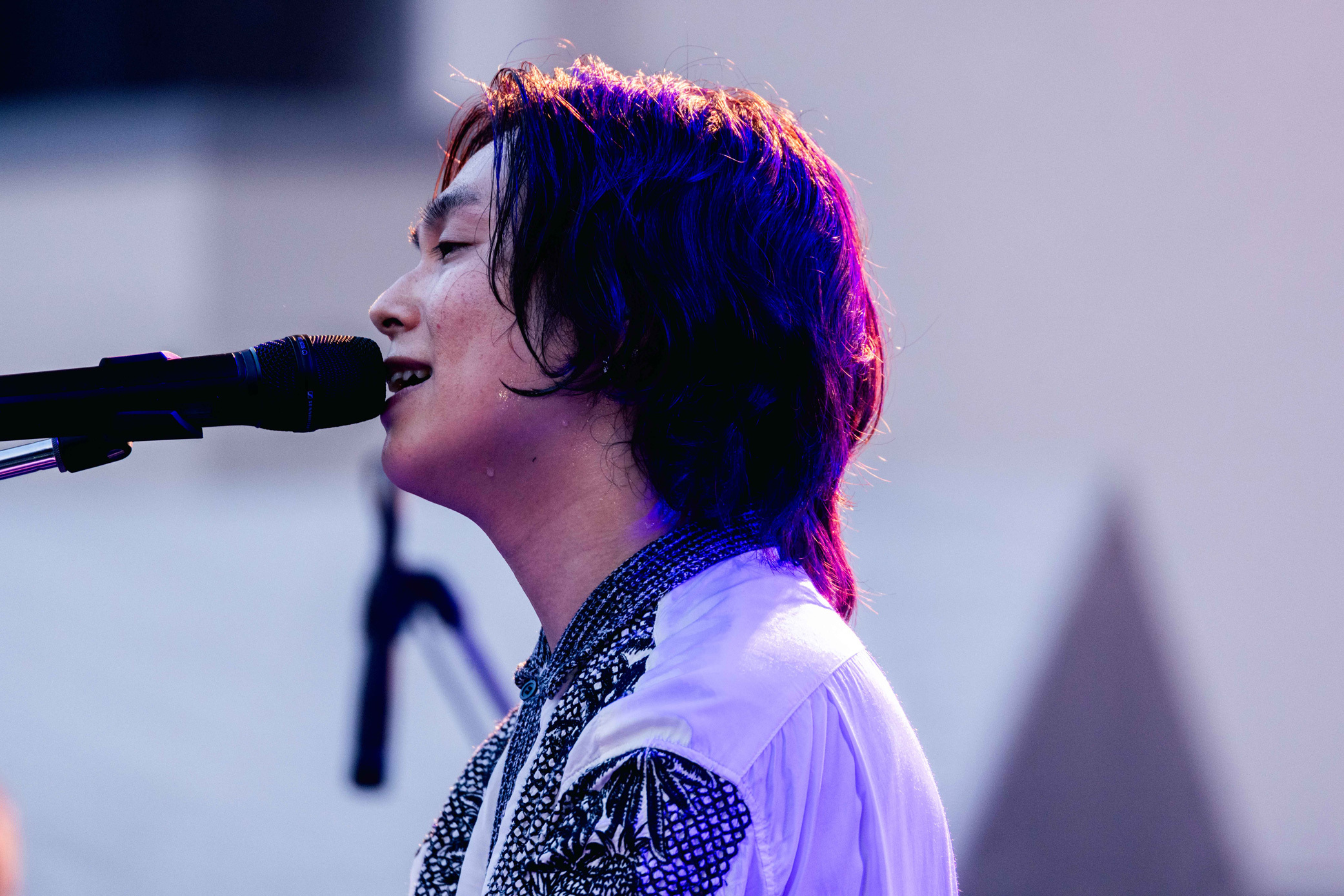 「僕らは夜にやるのは久しぶりだし、皆さんも周りに見えてはいないから好きに踊ってください」(川谷、以下同)といざない、アーバンなシンセとファルセットボイスが機能した「夜風とハヤブサ」ではマイクを片手に気持ち良さそうに歌い上げ、「ハルの言う通り」では再び激情のギターをかき鳴らす川谷。事前の対談でもレア曲満載のドープなメニューで挑むと公言していたが、佐々木みお(Cho)とDADARAY/katyushaのえつこ(Cho.Key)を加えた6人編成で矢継ぎ早に繰り出されていくどの曲もアートとポップのバランスが絶妙で、憂いと疾走感漂う「はにかんでしまった夏」といい、エッジの効いたアンサンブルでオーディエンスをじわじわ盛り上げていく。