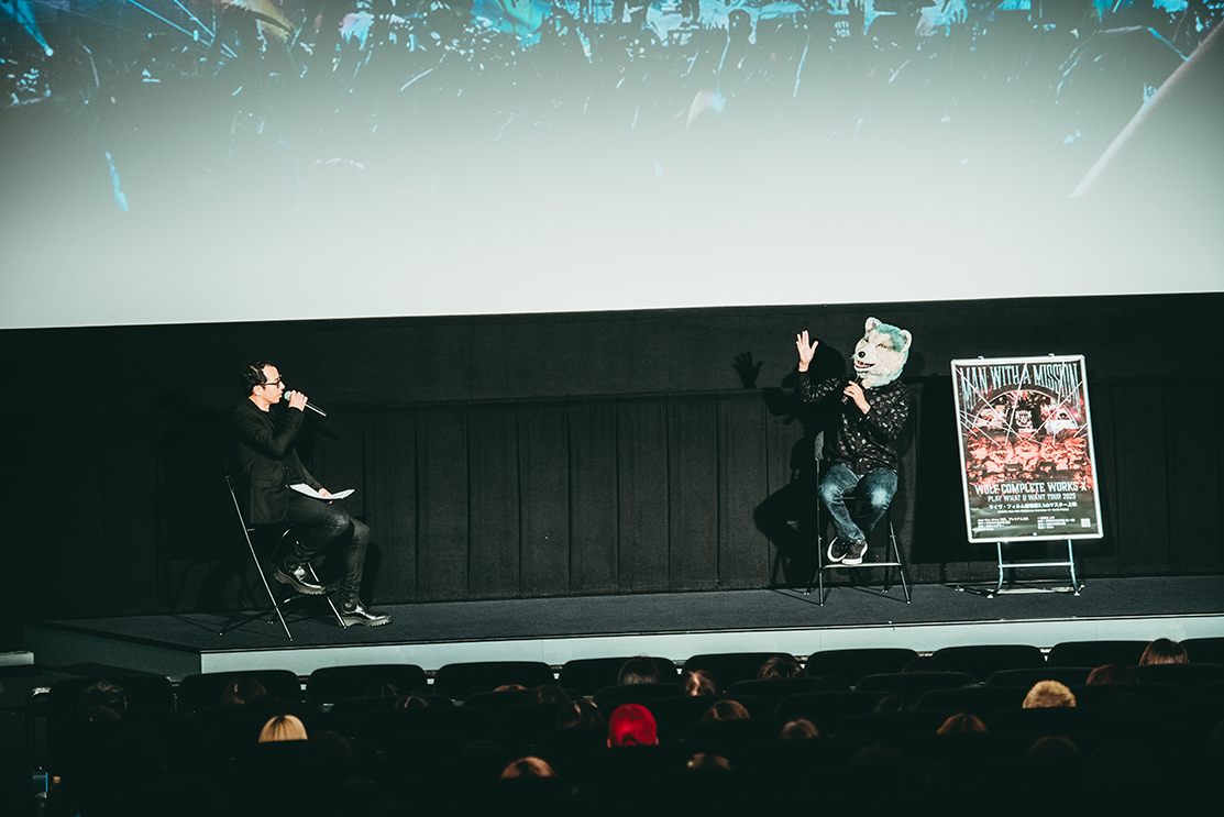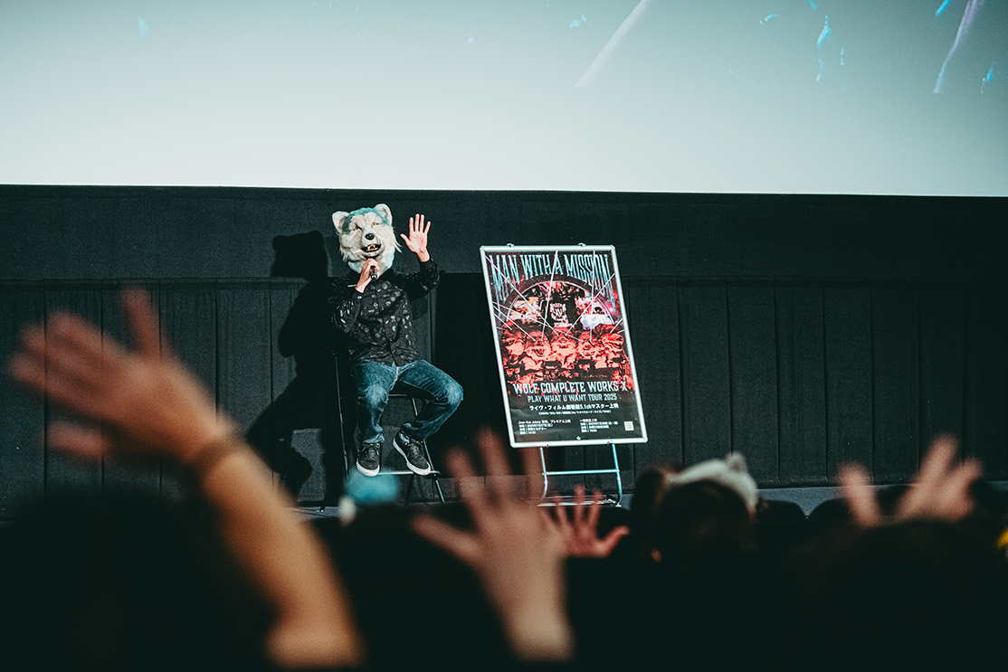 『Wolf Complete Works X ~MAN WITH A “15th” MISSION PLAY WHAT U WANT TOUR 2025~』は、ファン投票で構成された、いわばライブベストといえるセットリストで全18曲、1時間43分を完全収録。映画館上映のために『劇場版5.1ch』が施された映像を実際に目にしたJean-Ken Johnnyは「劇場用5.1chスサマジイデスネ。メチャクチャイイ。」とコメント。登壇にあたっては音楽ライターで、元ROCKIN’ON JAPAN編集長の小栁大輔氏がMCとして登場。活動15周年の想いを問われると「長イヨウデアットイウ間。自分タチノ活動ガ皆様ノオカゲデ、モノスゴイ、張リ切ッテヤッテイルト同時ニマイペースデ等身大ノ自分タチノペースデ活動デキタコトガ功ヲ奏シマシタ。」と述べた。さらに、Kアリーナ横浜で実施されたツアー公演での裏エピソードにも触れ、公演冒頭の入場SEはファンリクエストで構成したセットリストのうち1曲目が決まってから手掛けたものだったそうで、楽曲と同一のBPMでオリジナル制作されたという。