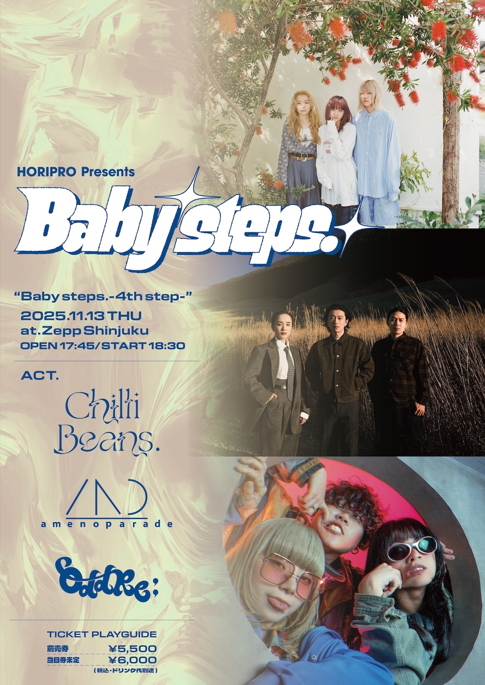 本公演は、「音楽ファンが様々なアーティストと出会うきっかけの場所となり、それぞれの人生のBaby steps.となりますように。」という願いが込められている。4回目の開催となる今回は、等身大で自由に表現される楽曲やライブパフォーマンスで人気を集めているChilli Beans.、幅広い音楽性を兼ね備え、ユニークな存在感を放ち続けてきた雨のパレード、SNSを中心に話題沸騰中の次世代バンド・OddRe:の3組が出演することが決定。