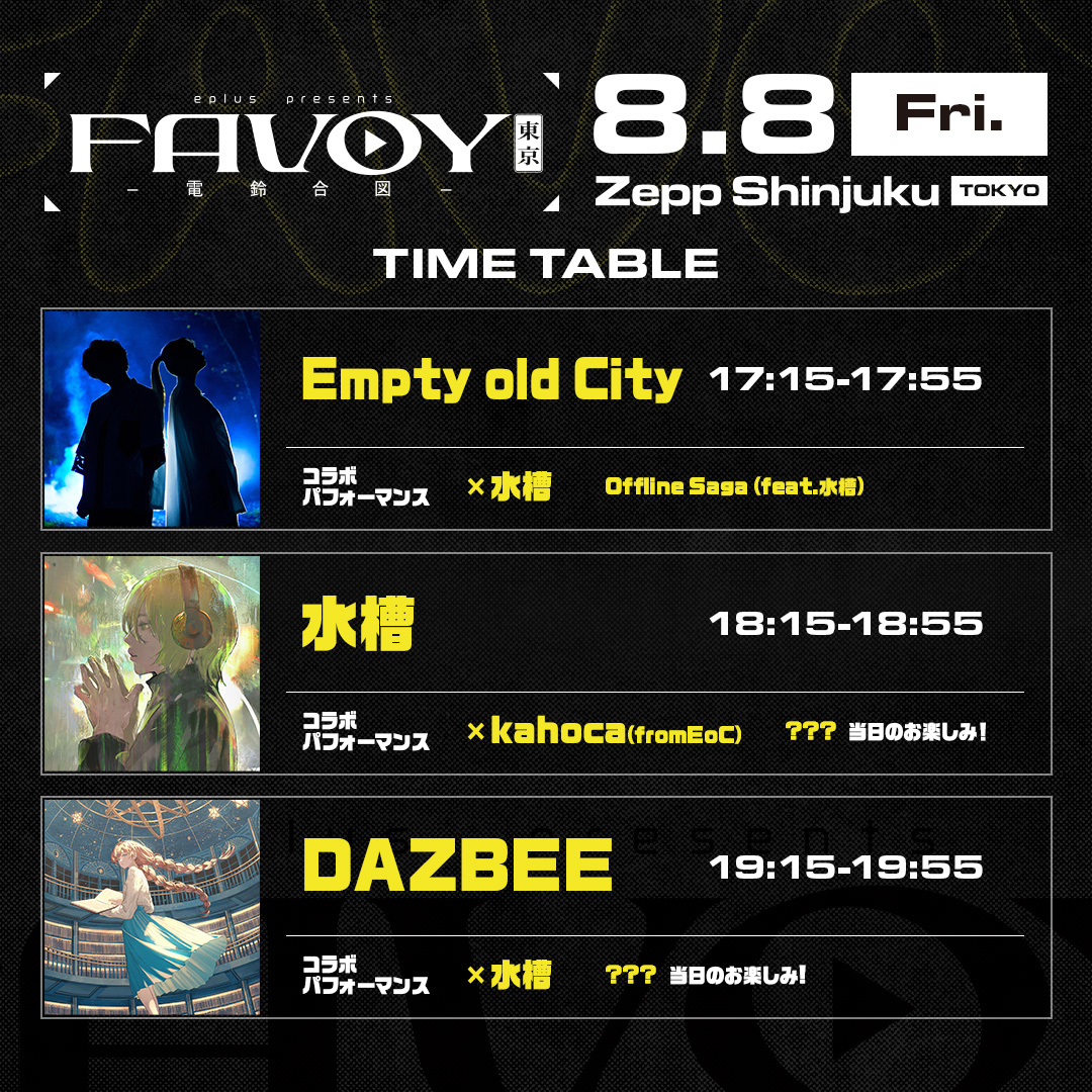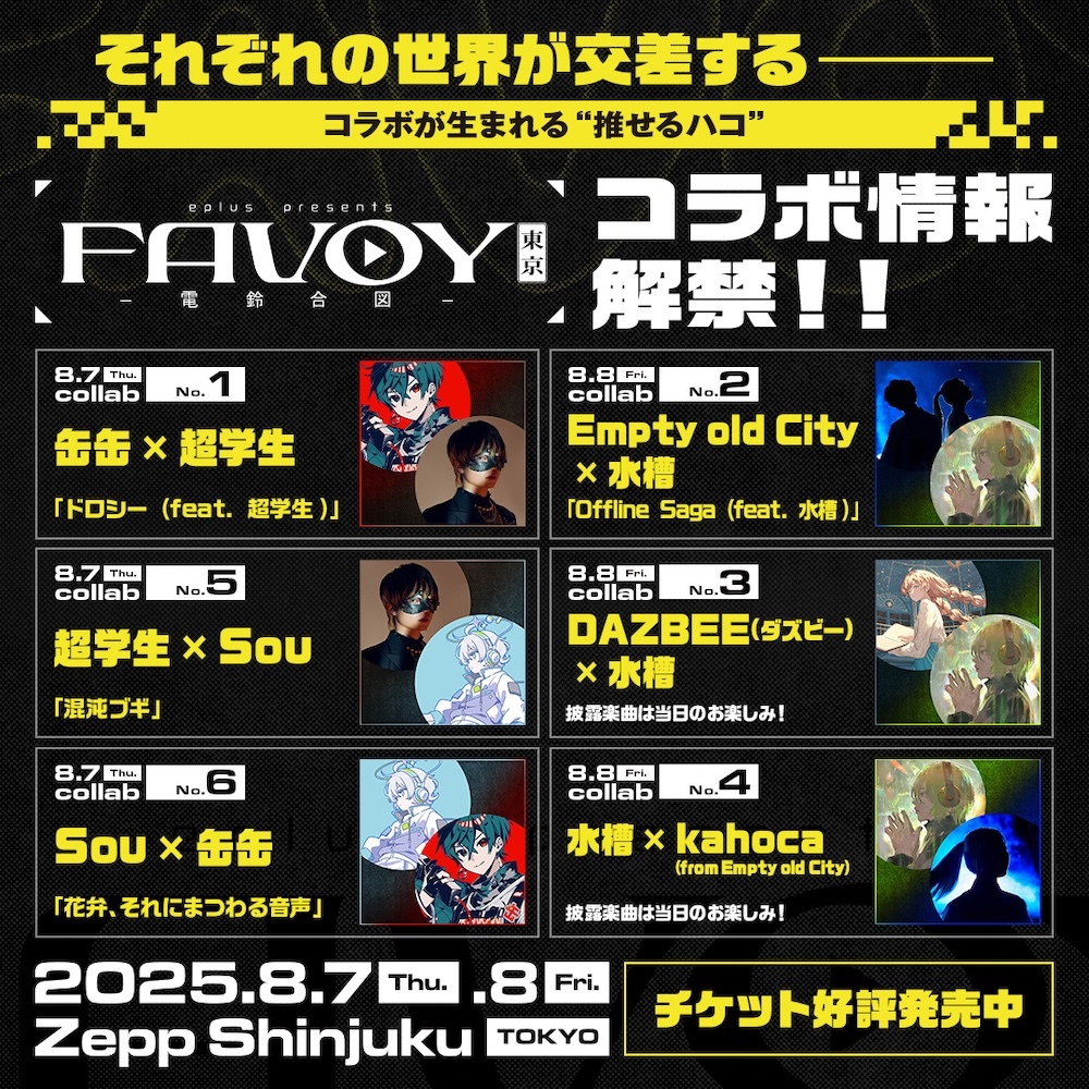 ボカロP・歌い手・Vtuberなど、細分化されたネット音楽を網羅しようと始動したプロジェクト「FAVOY」の初となるライブイベント『eplus presents FAVOY TOKYO -電鈴合図-』が、8月7日(木)・8日(金)にZepp Shinjuku(TOKYO)にて開催される。本日、出演アーティストたちによる全6組のコラボパフォーマンスとタイムテーブルが発表された。