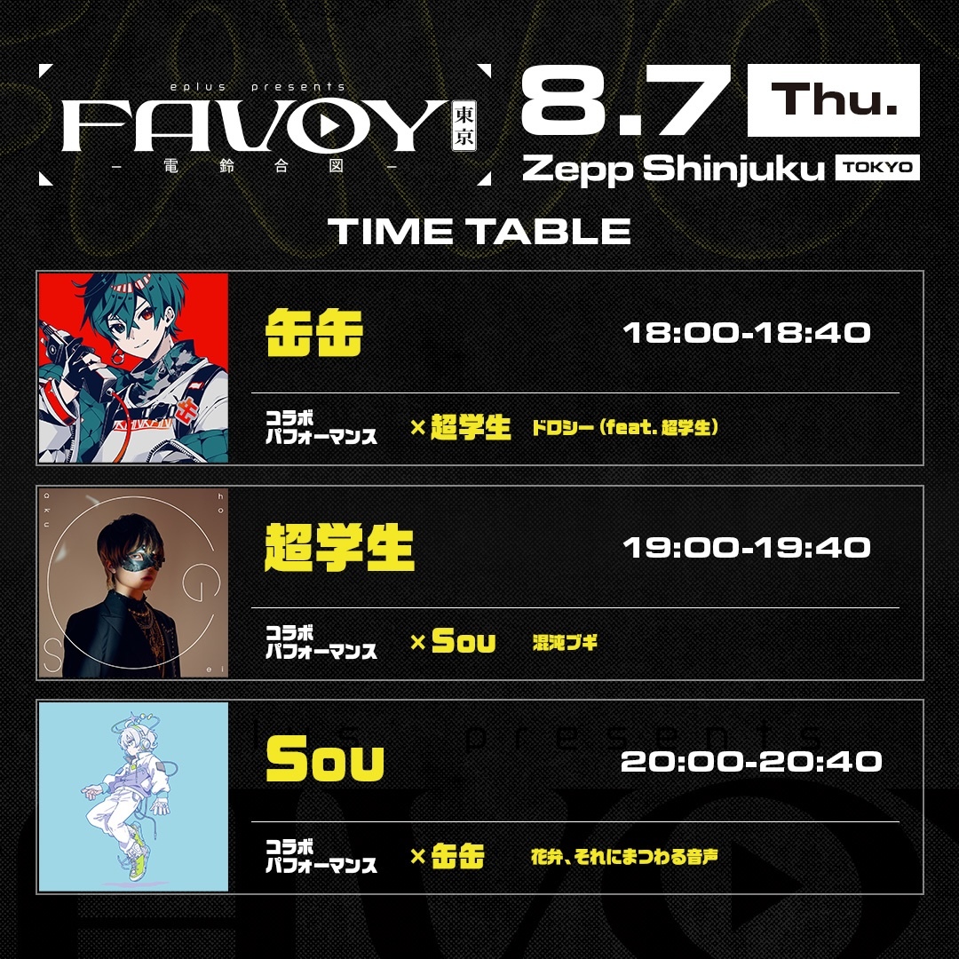 そして、Webメディアplug+でのYouTube番組『replay room』にて、『歌い手 Sou×超学生 45分間対談。“FAVOYってどんなイベントですか?行った方が良いですか?”』も公開中。