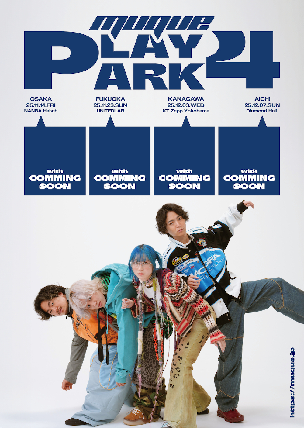 また、併せて解禁された自主企画『muque “PLAYPARK 4″』は、全国4箇所で開催予定で、各会場それぞれGUEST ACTを迎え開催される。チケットは本日・7月31日(木)よりFC抽選先行を実施中。