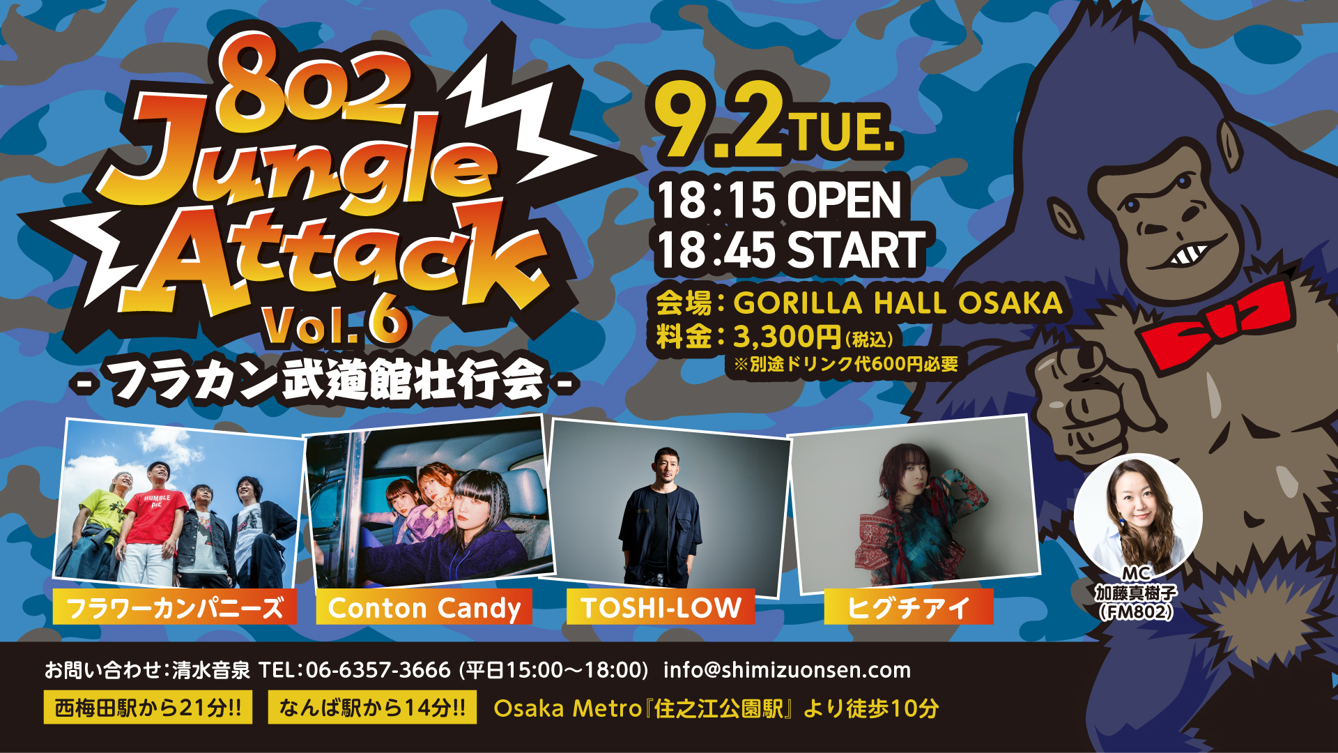 今回は9月20日(土)に日本武道館での公演を控えるフラワーカンパニーズの公演成功を祈願し、『802 Jungle Attack Vol.6 -フラカン武道館壮行会-』と題して開催。大阪からも盛り上げていくべく、Conton Candy、TOSHI-LOW、ヒグチアイをゲストに迎えた一夜限りのライブパーティーとなる。