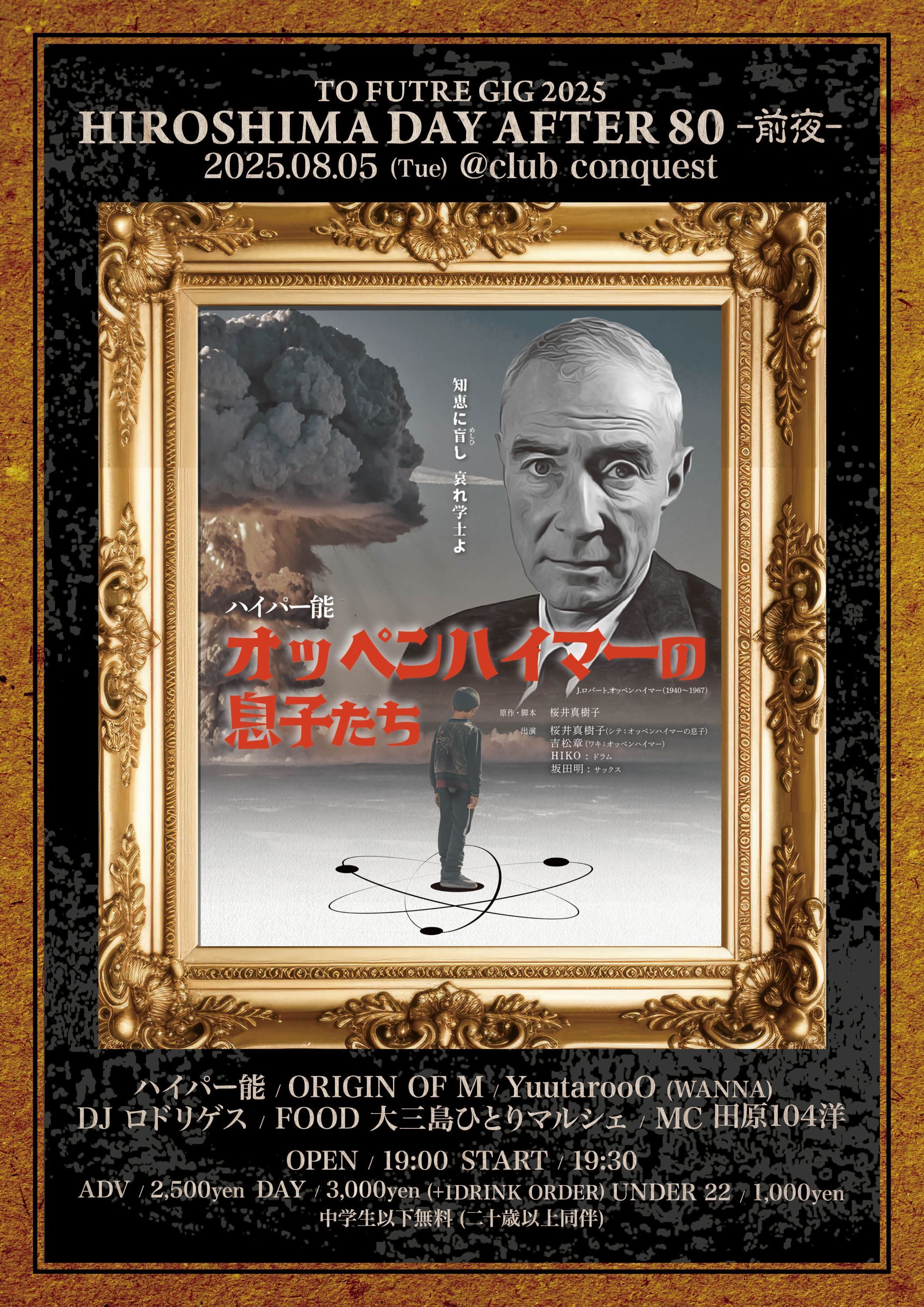 前日の8月5日(火)には、広島のclub conquest にて『TO FUTURE GIG 2025 -HIROSHIMA DAY AFTER 80- 前夜』も開催。ハイパー能による、原爆の父オッペンハイマーの存在に目を向けた新作『オッペンハイマーの息子たち』を上演するほか、ORIGIN OF M、YuutarooO(WANNA)、ロドリゲス(DJ)、田原104洋(MC)が出演、大三島ひとりマルシェがフード出店する。