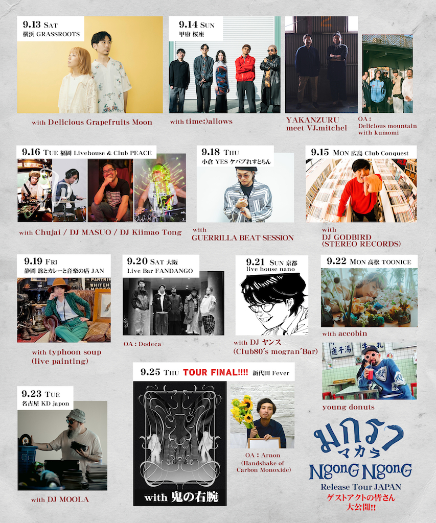 タイと日本を拠点とするネオ・モーラムバンドのMAKARAが8月8日(金)に発売する4thアルバム『Ngong Ngong』の全世界同時発売に伴い、9月13日(土)から開催される全国ツアー『”NgonG NgonG” RELEASE TOUR JAPAN』の対バンアーティストが発表された。