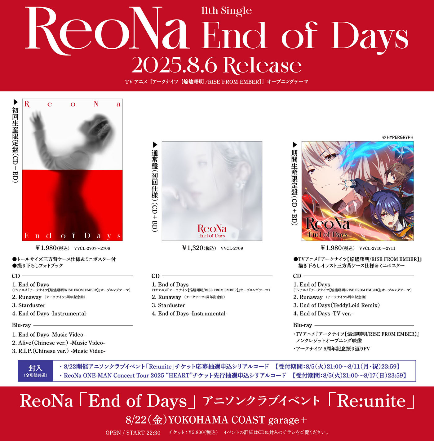 「End of Days」は初回生産限定盤、通常盤、期間生産限定盤の3形態での展開となり、表題曲「End of Days」をはじめ、アークナイツ5周年記念曲「Runaway」、ボカロPとしても知られるジミーサムP「Starduster」のReoNaによるカバーも収録。