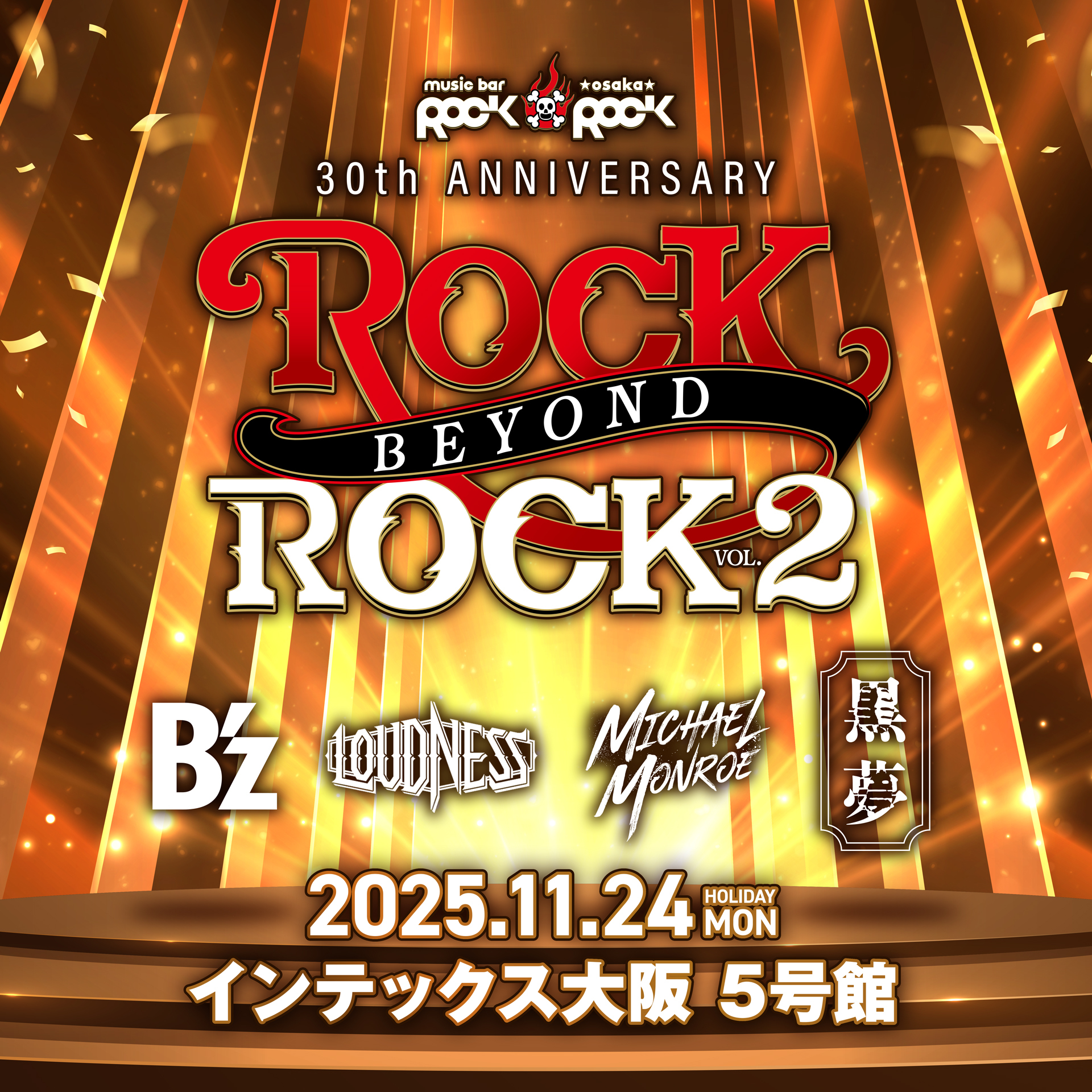 大阪・心斎橋の老舗ミュージックバーROCKROCKの30周年を祝い開催される同イベント。出演はB’z、LOUDNESS、MICHAEL MONROE、黒夢の4組。ROCKとともに歩んだ30年の集大成を、音で体感できるイベントとなる。